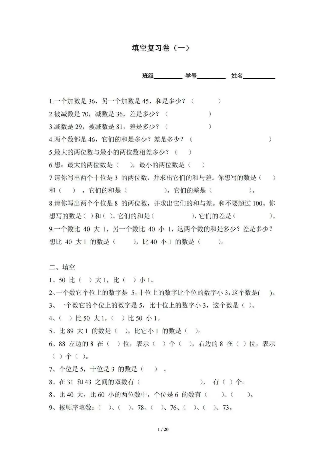 2026春小学低年级数学填空复习卷三套PDF高清可打印,加减法乘除法专项巩固