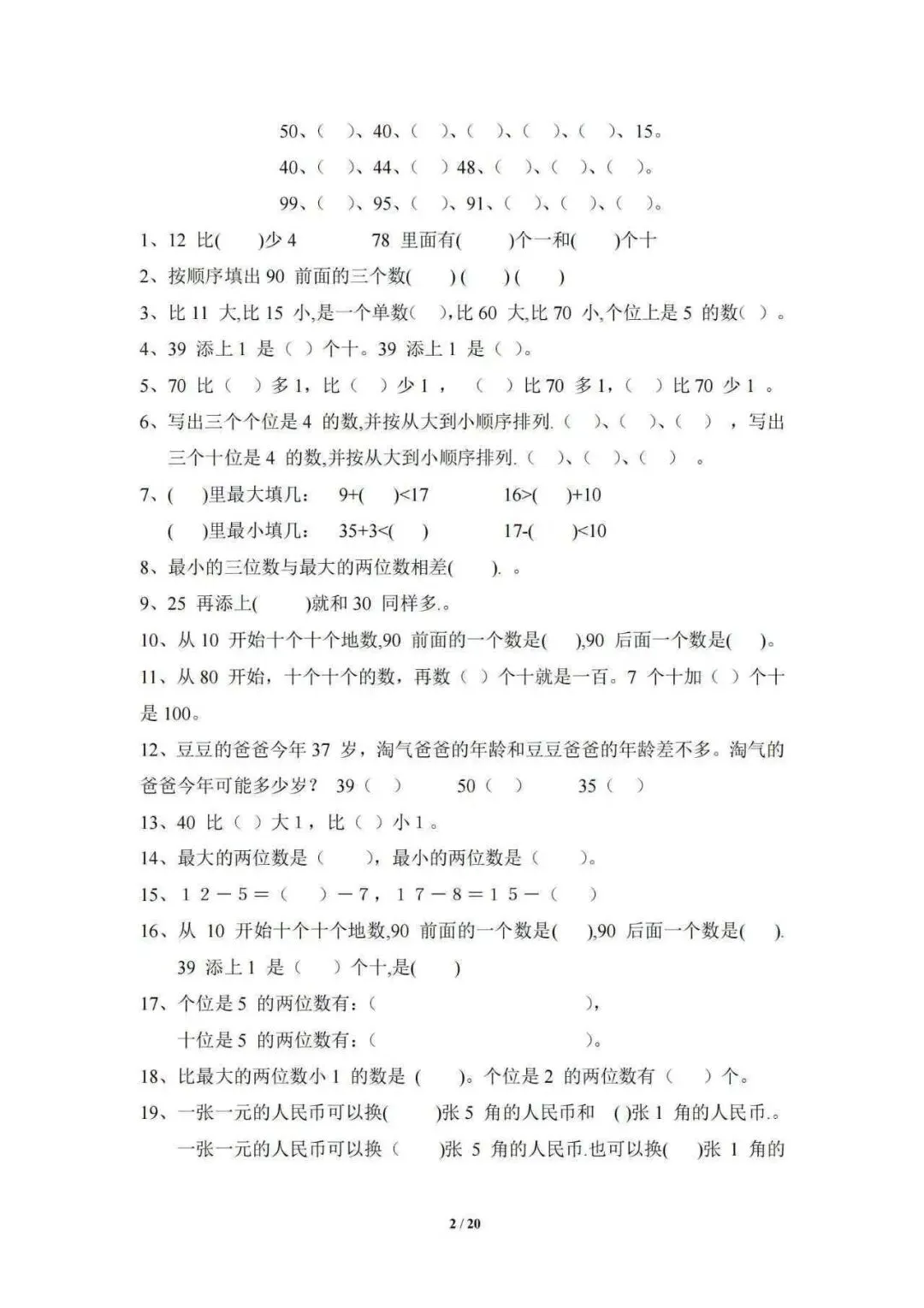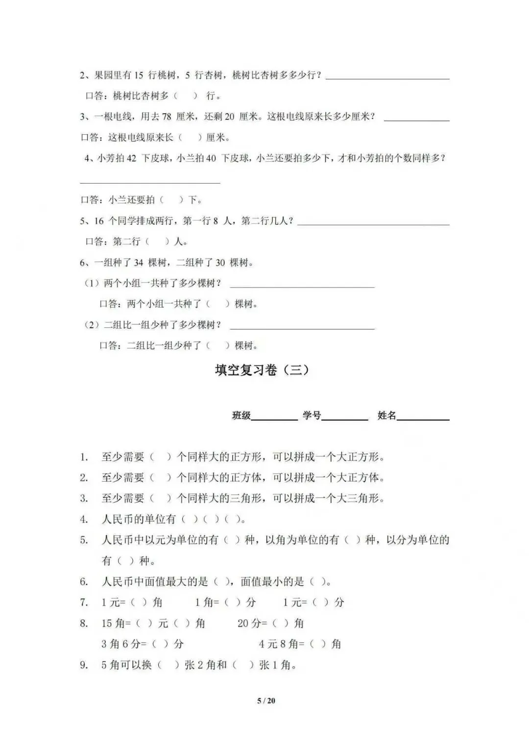 :三套填空复习卷,内容涵盖加减法、乘除法、数的认识、人民币、时间、长度等核心知识点。 - 高清排版,方便打印