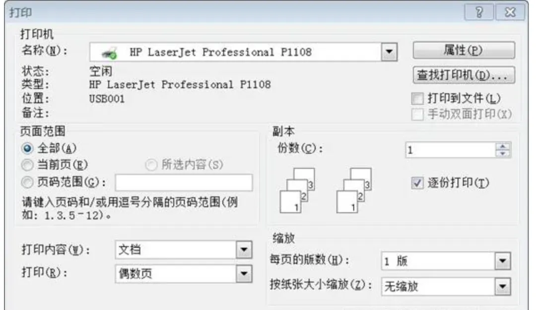3. 选择“文件”→“打印”→“打印(R)”,设置偶数页,点击“确定”。