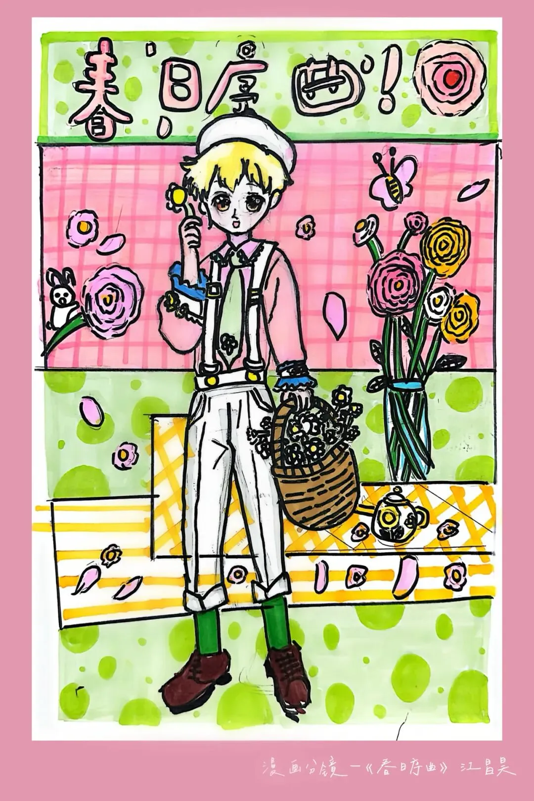 四年级—漫画人物分镜 亲爱的家长们,这节课我们完成了《漫画分镜—春日序曲》,以春天为主题,运用分镜构图、人物造型与色彩搭配,描绘出充满春日气息的漫画场景。分镜构图 学习漫画分镜的基本布局,通过多格画面组织故事感,掌握画面分割与主次安排。造型表现 刻画人物的发型、服饰、动态特征,结合春日元素丰富角色形象。色彩氛围: 运用明快、清新的色彩表现春日主题,通过色彩搭配营造温暖、活泼的视觉效果。 我的春日分镜日记 用2-4格漫画画出自己在春天里的一件小事,如赏花、野餐、散步。