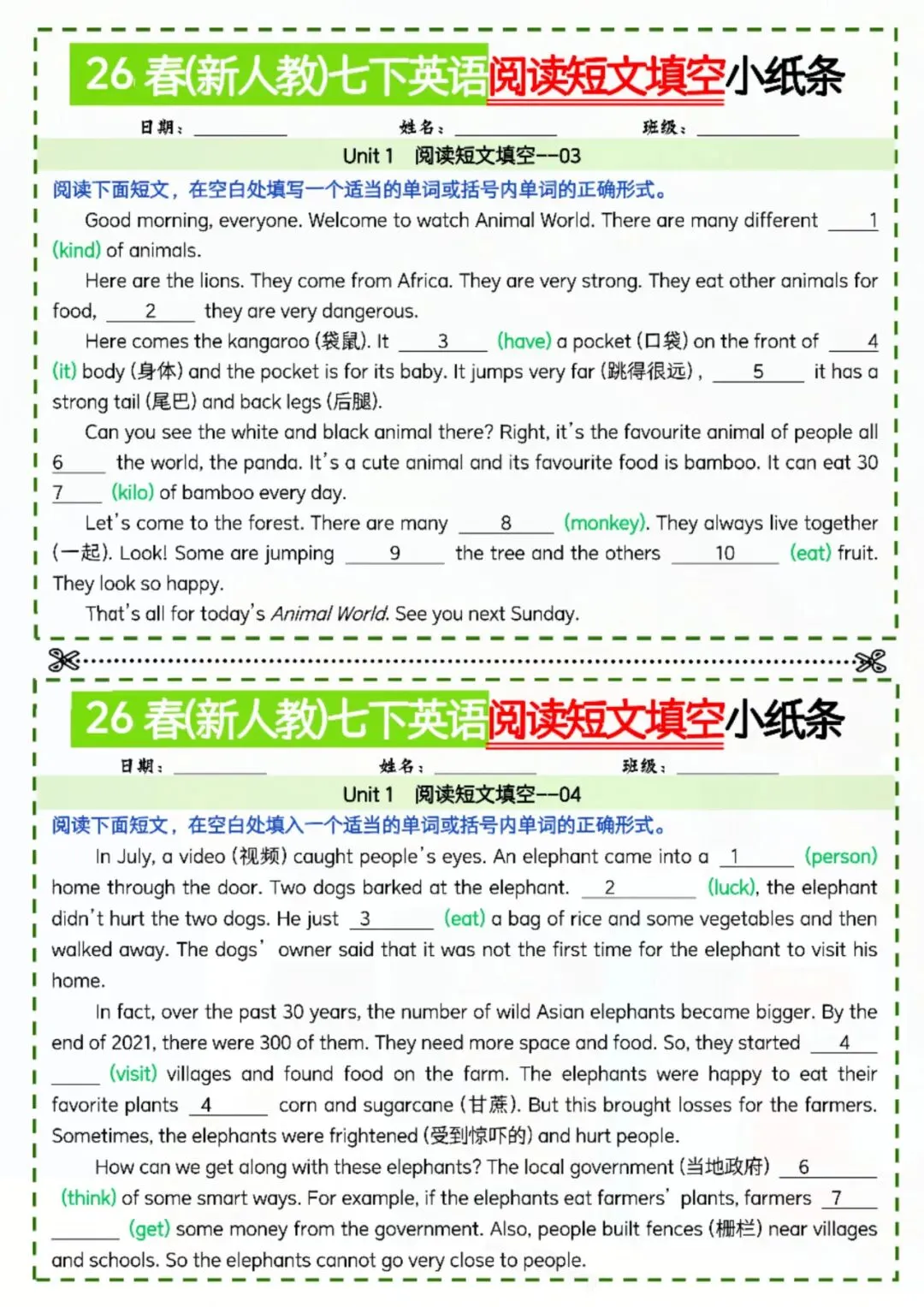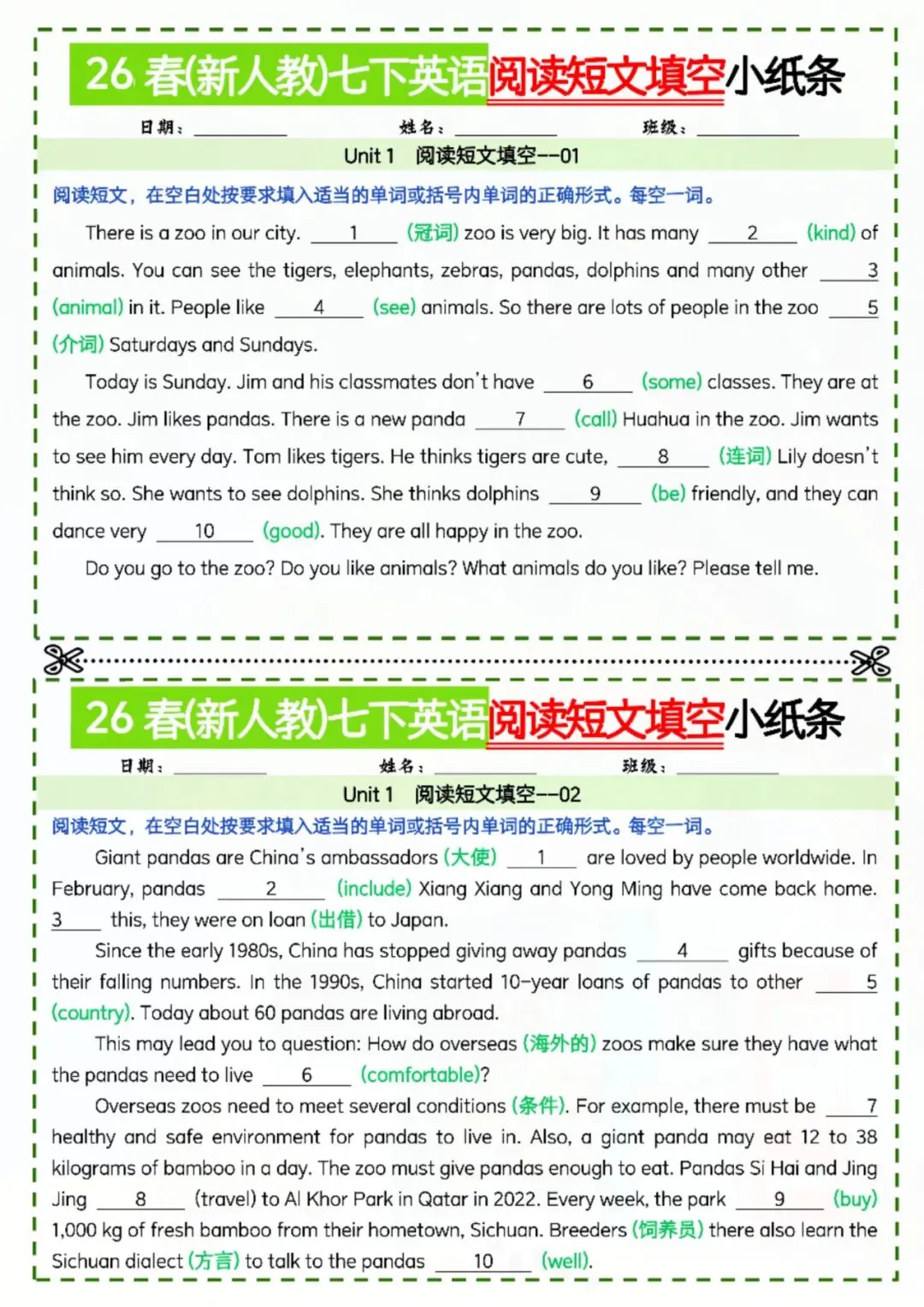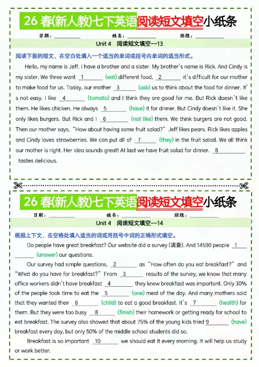 今天老师给大家整理了:七年级下册英语阅读短文填空小纸条 电子版可打印!