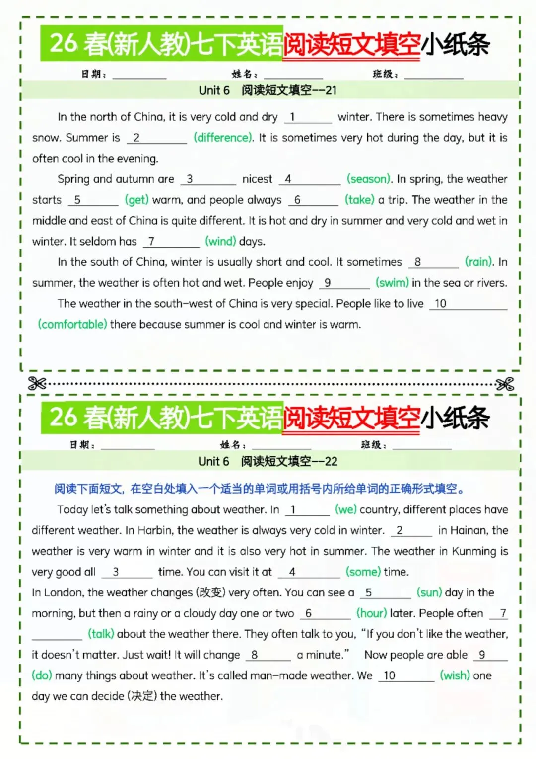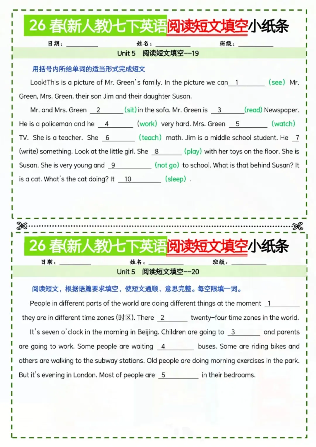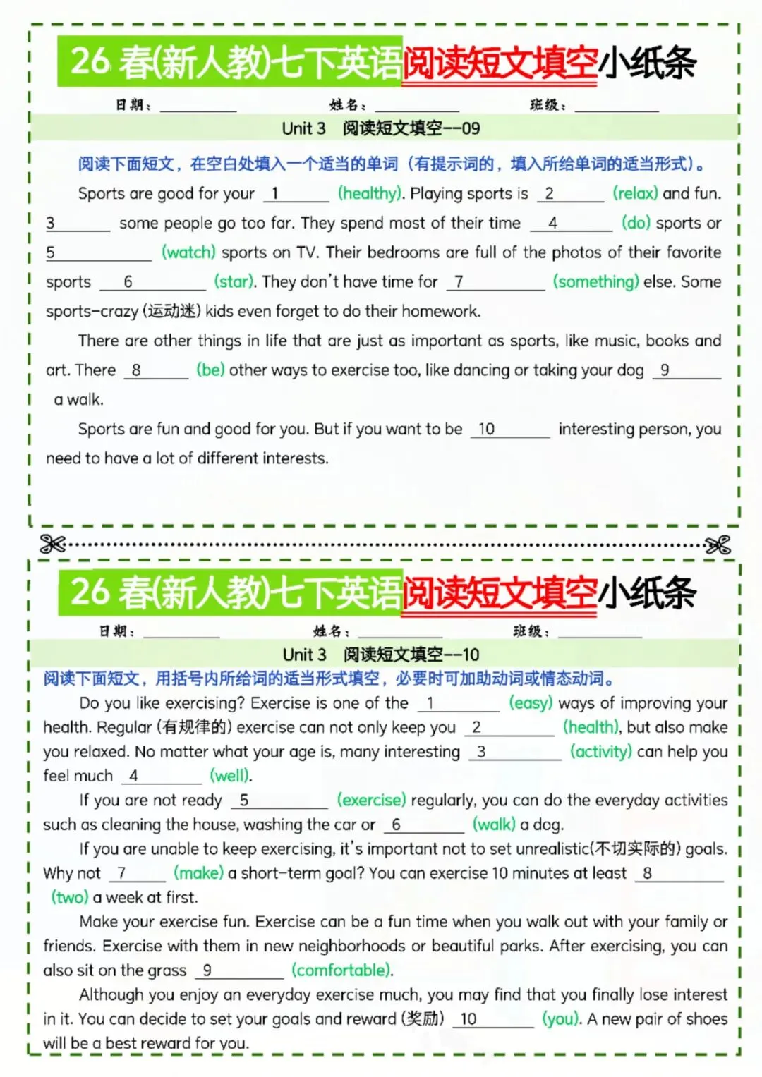 今天老师给大家整理了:七年级下册英语阅读短文填空小纸条 电子版可打印!
