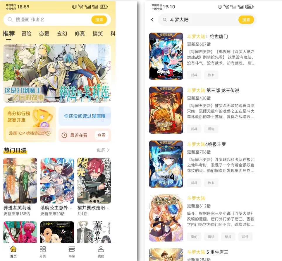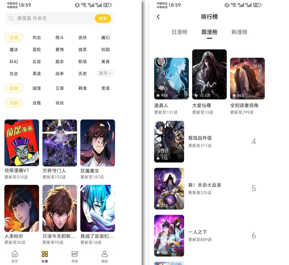 打开 APP 就能快速上手:首页有推荐、排行、分类三大板块,连载新作、完结经典全都有,而且实时同步更新,第一时间就能看到最新章节,全网漫画无限制畅看。