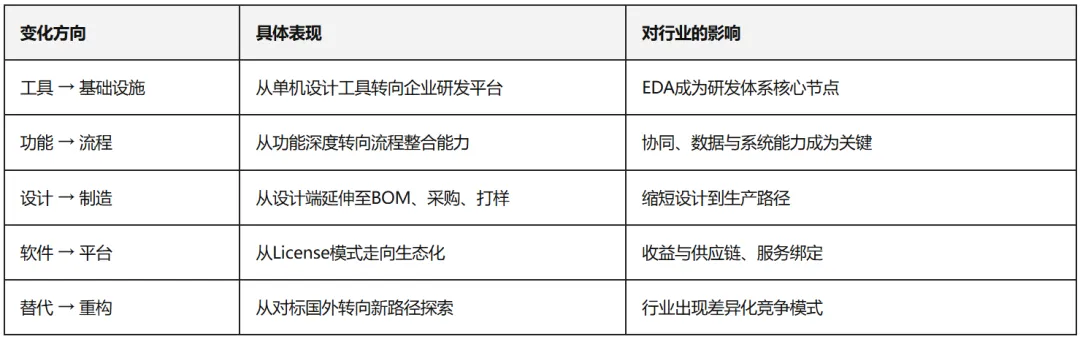 过去,EDA厂商之间的竞争主要集中在功能、性能与价格层面,而现在,企业更加关注协同效率、数据治理、系统打通以及设计与制造之间的联动能力。随着EDA边界的扩展,其竞争维度也从软件延伸至生态。EDA也由此逐渐具备平台属性,需要连接设计、物料、企业IT系统乃至生产环节,承担更复杂的组织与流程角色。