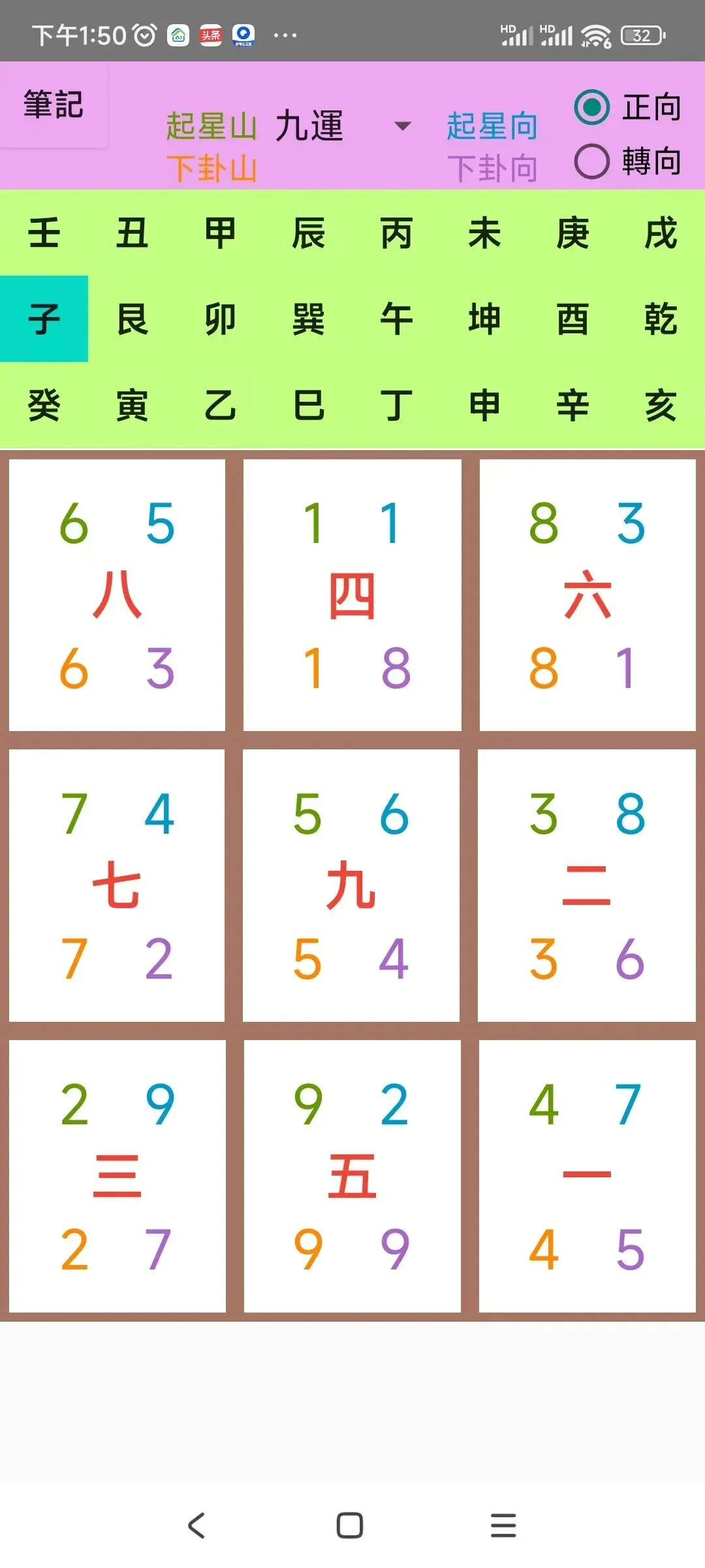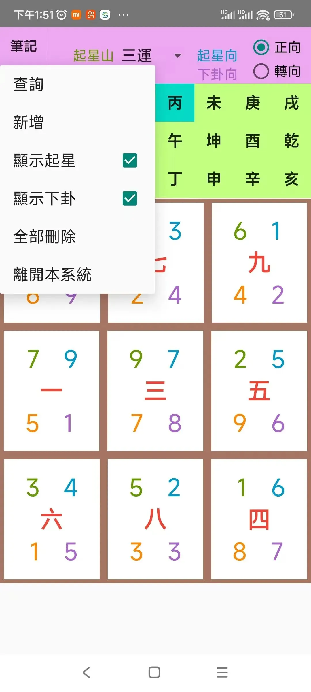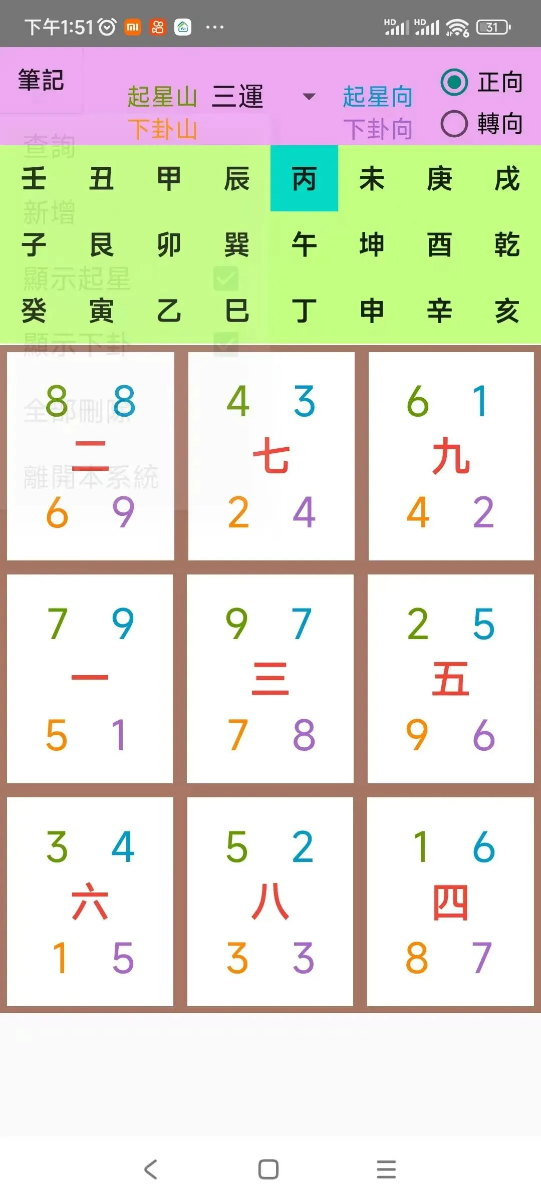软件能根据条件排出24山一至九运的玄空飞星盘,用四种不同的颜色标示出:起星山(绿色),下卦山(棕色),起星向(蓝色),下卦向(紫色)等飞星数。也可以显示或隐藏起星或向星,有正向转(兼)向选择和保存功能。操作简单方便一目了然,是学习研究玄空飞星非常好的软件。