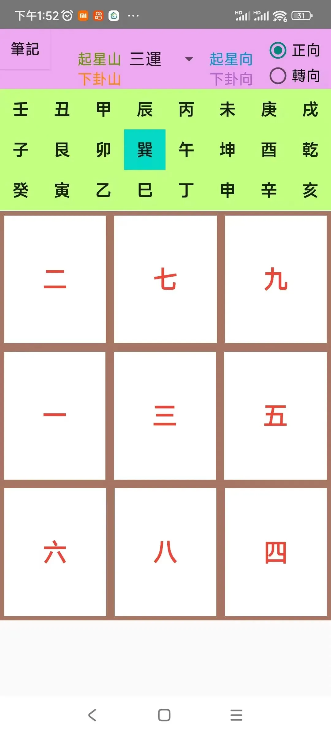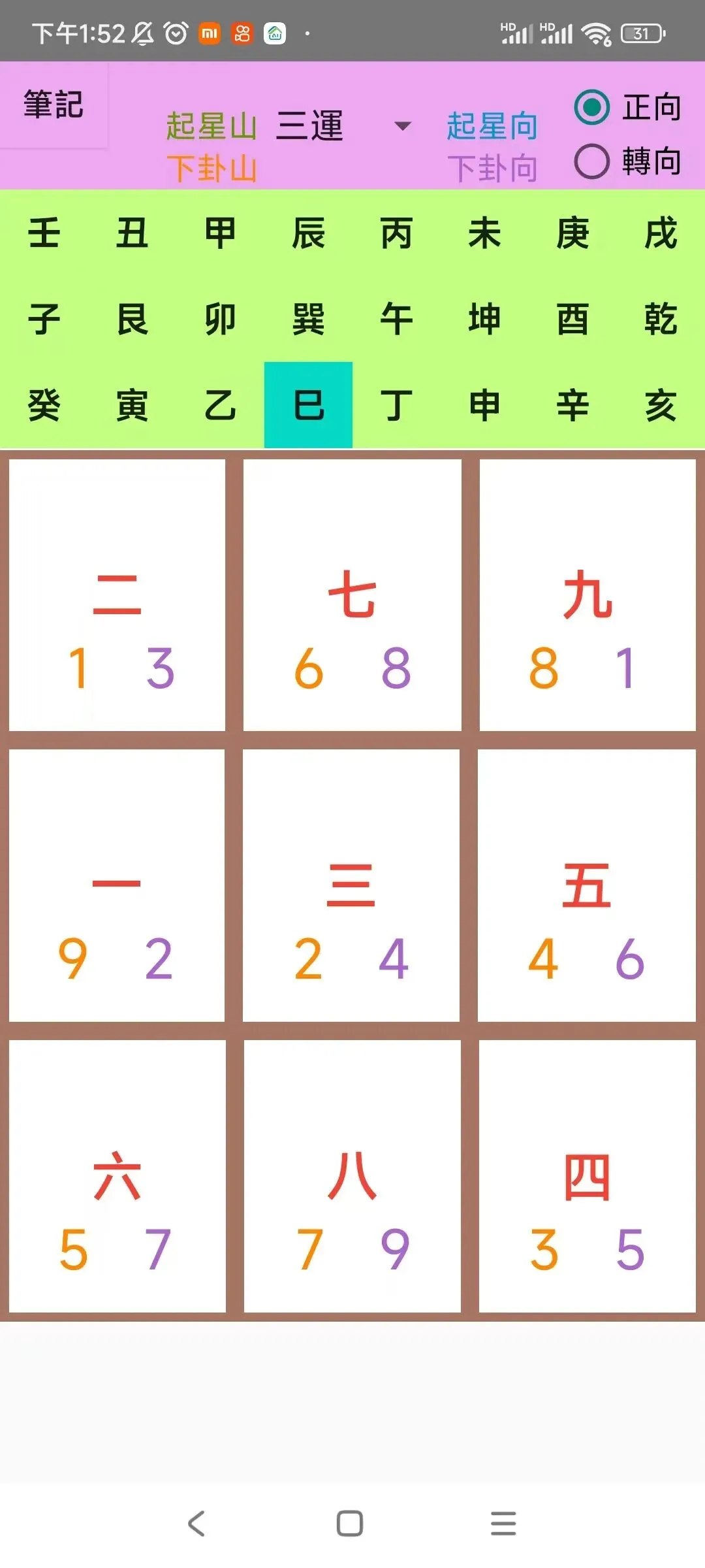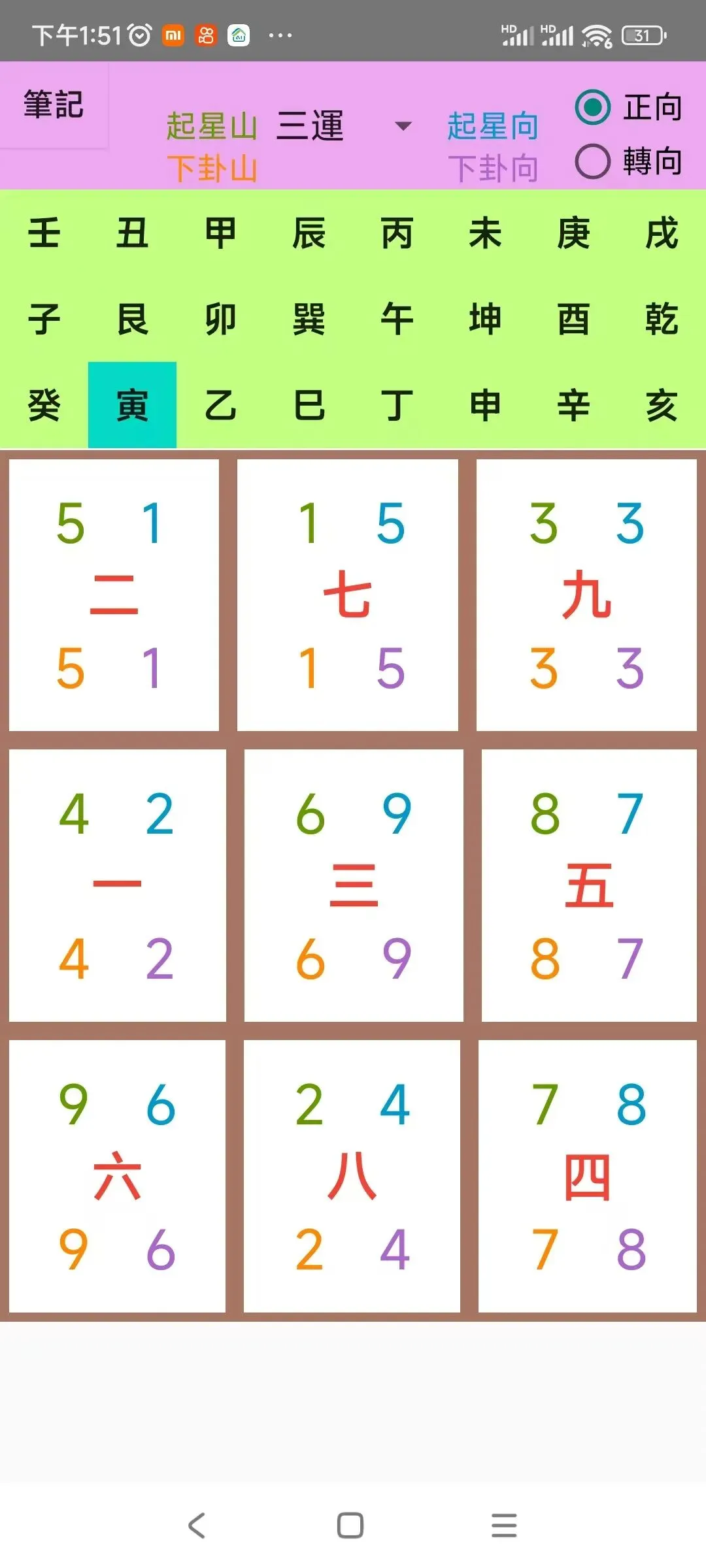 软件能根据条件排出24山一至九运的玄空飞星盘,用四种不同的颜色标示出:起星山(绿色),下卦山(棕色),起星向(蓝色),下卦向(紫色)等飞星数。也可以显示或隐藏起星或向星,有正向转(兼)向选择和保存功能。操作简单方便一目了然,是学习研究玄空飞星非常好的软件。
