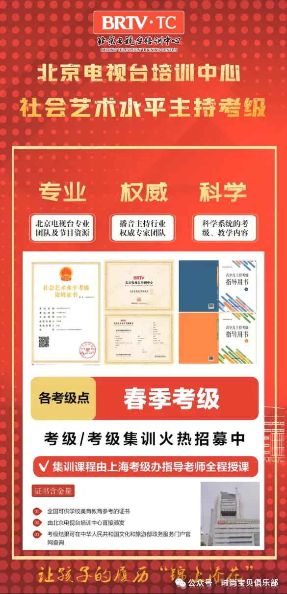 艺术素养的提升,离不开专业训练与舞台历练。考级联盟集训营涵盖北京电视台培训中心主持考级、校外艺术水平考级、声动中国语言艺术展演、未来杯青少儿艺术盛典四大核心项目,邀请专业师资授课,从专业技巧打磨到舞台实战演练,全方位提升孩子的艺术表现力,助力孩子顺利通过考级、斩获荣誉,在艺术舞台上自信发光。