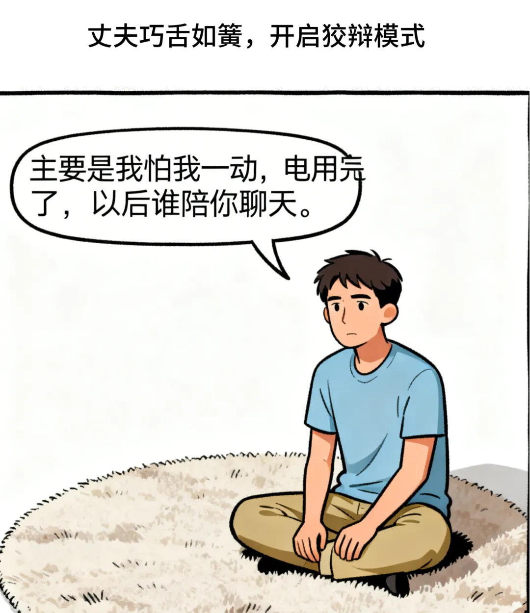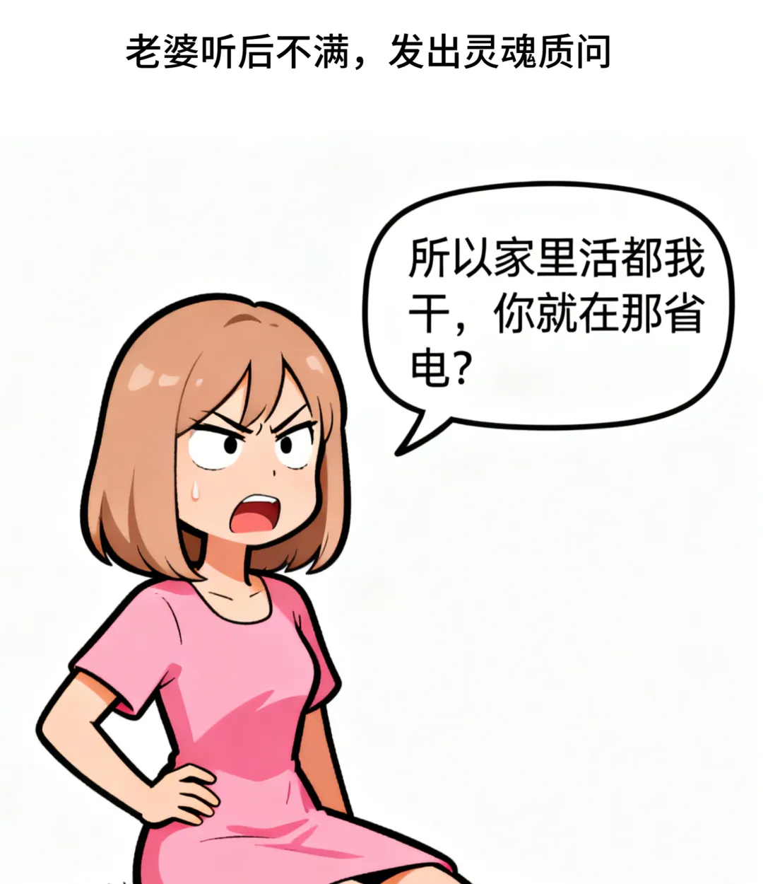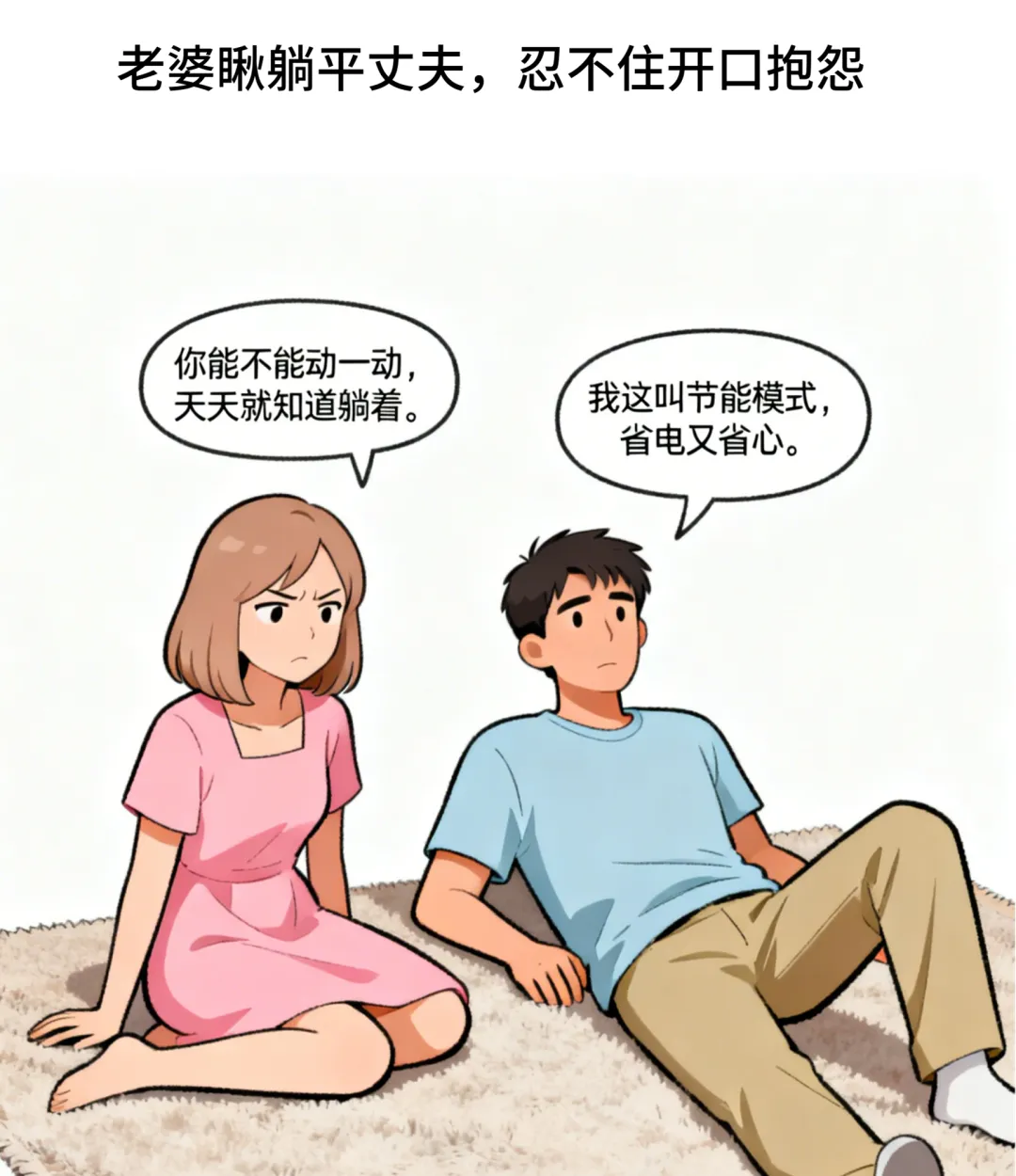 趣味漫画:老婆:你能不能动一动,天天就知道躺着.老公:我这叫节能模式,省电又省心.老婆:行,你有理,碗还是你去洗.
