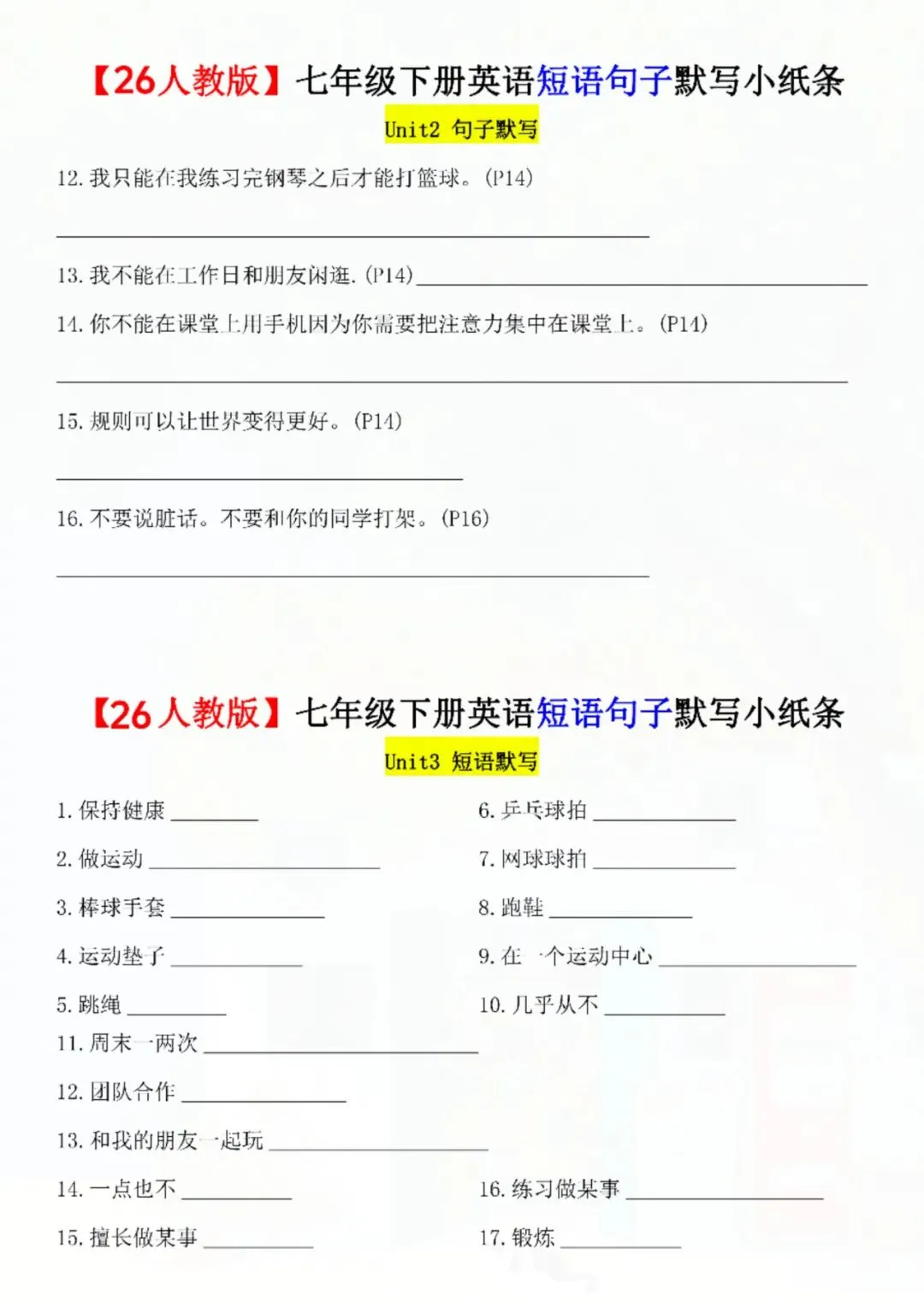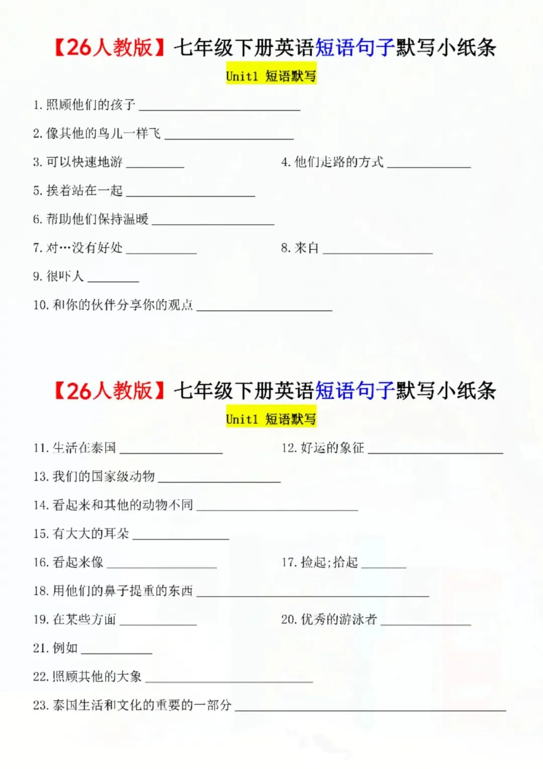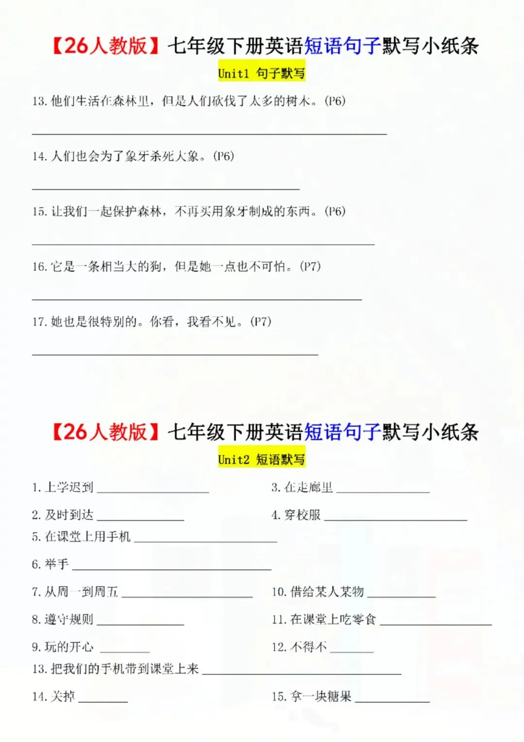 今天老师给大家整理了:七年级下册英语短语句子默写小纸条 电子版可打印!