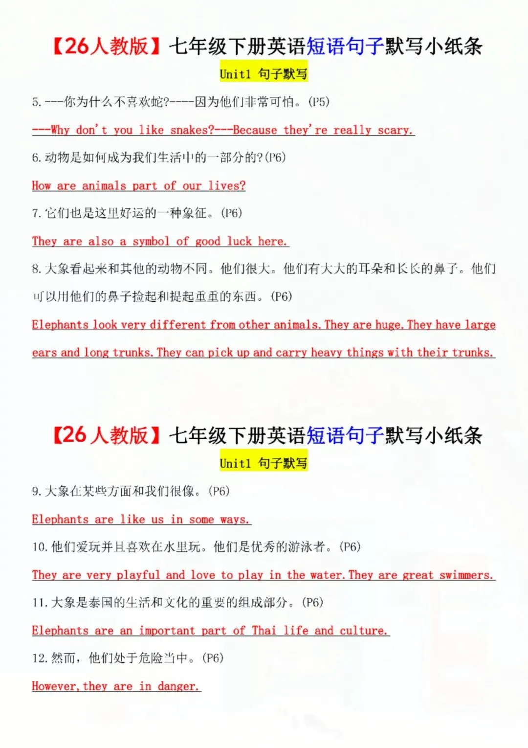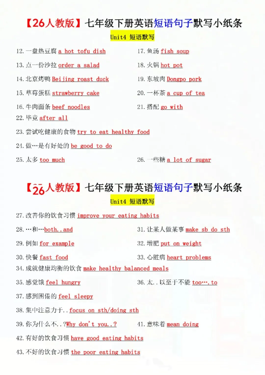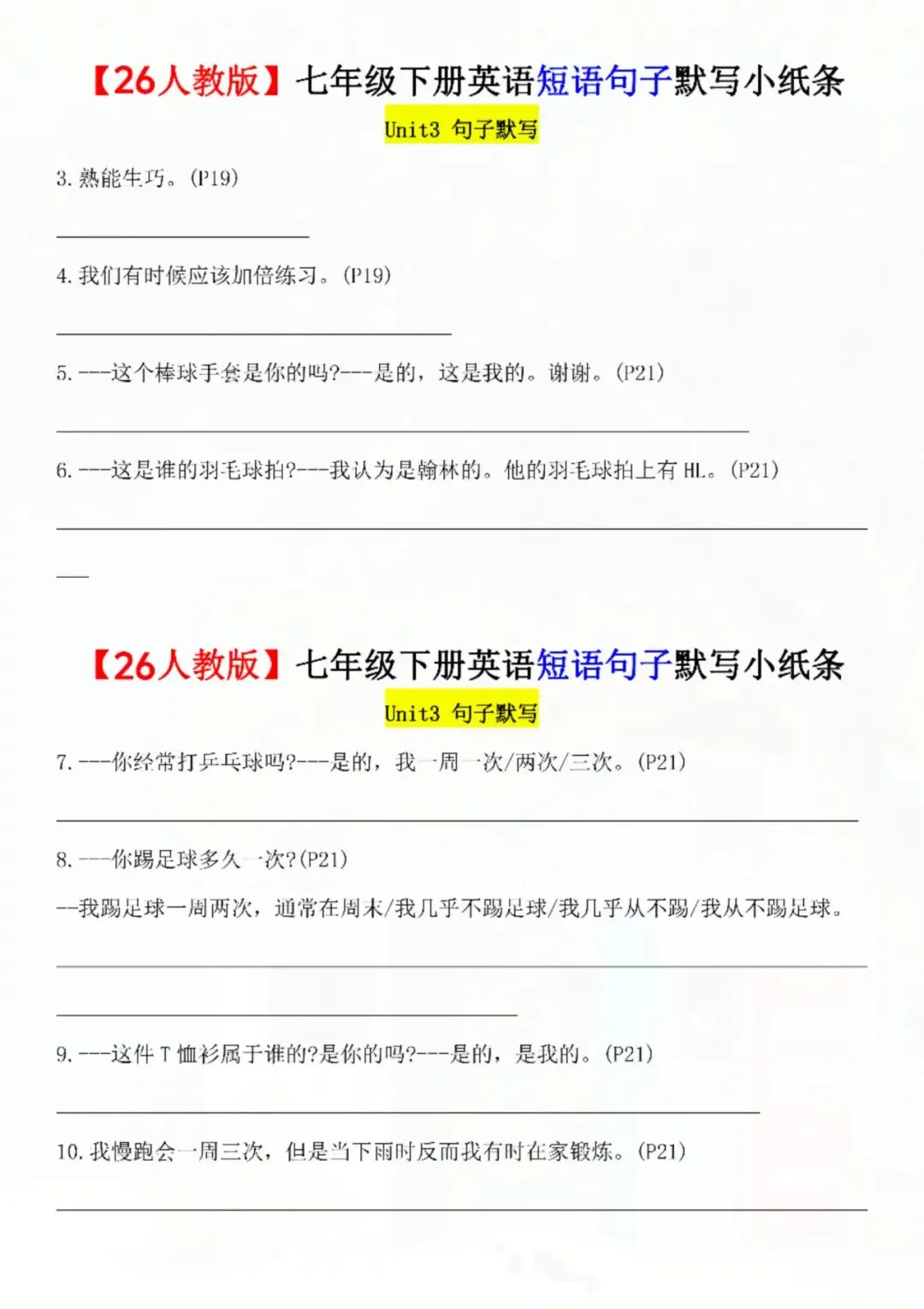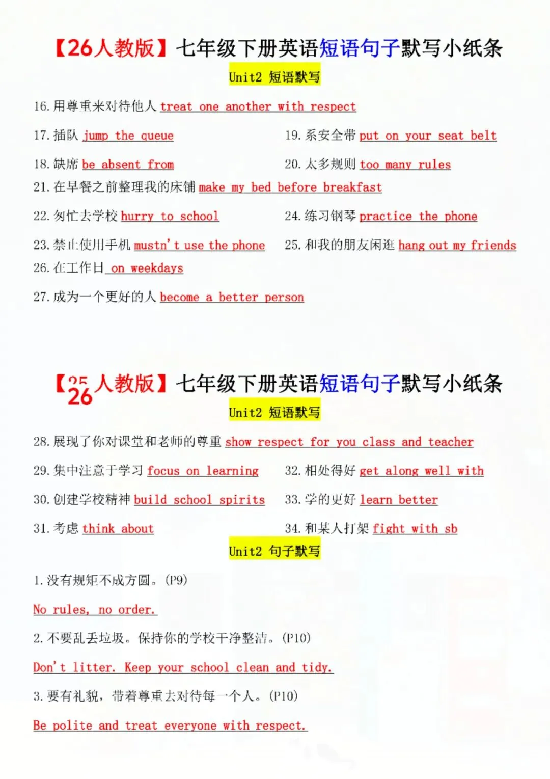 今天老师给大家整理了:七年级下册英语短语句子默写小纸条 电子版可打印!