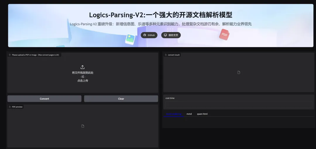 阿里提供了在线 Demo 平台,可以直接上传 PDF 页面图片体验解析效果,无需本地部署: