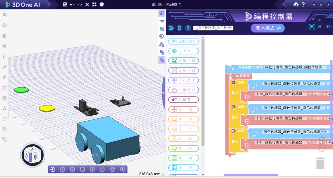 双模式操作支持:学生既可通过直观的界面交互控制物体,也可通过Python或图形化编程实现复杂逻辑,模拟自动驾驶、机器人巡线、智能家居等场景。