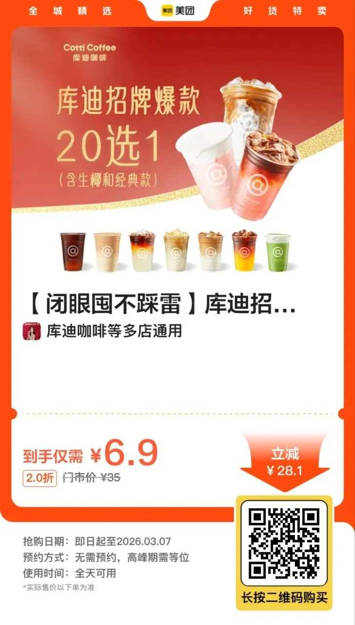 4,【到店】库迪咖啡招牌爆款20选1 6.9元