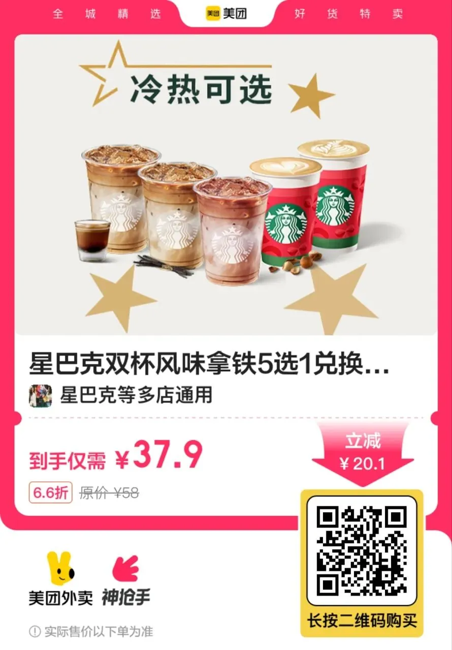 6,【美团外卖】星巴克拿铁5选2(大杯)44.9元,随时可用