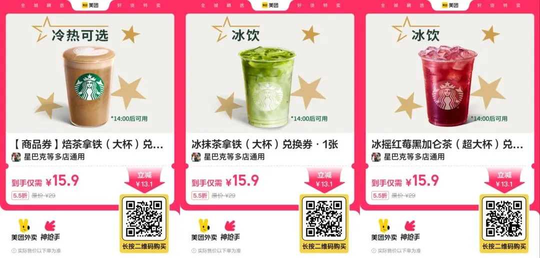 7,【美团外卖】星巴克焙茶拿铁大杯/冰抹茶拿铁大杯/红莓黑加仑超大杯 18.9元 14点后可用