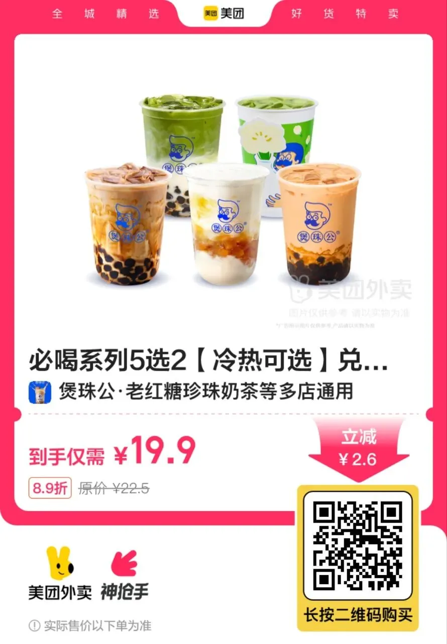 8,【美团外卖】煲珠公奶茶5选2 19.9元 【今日新增】