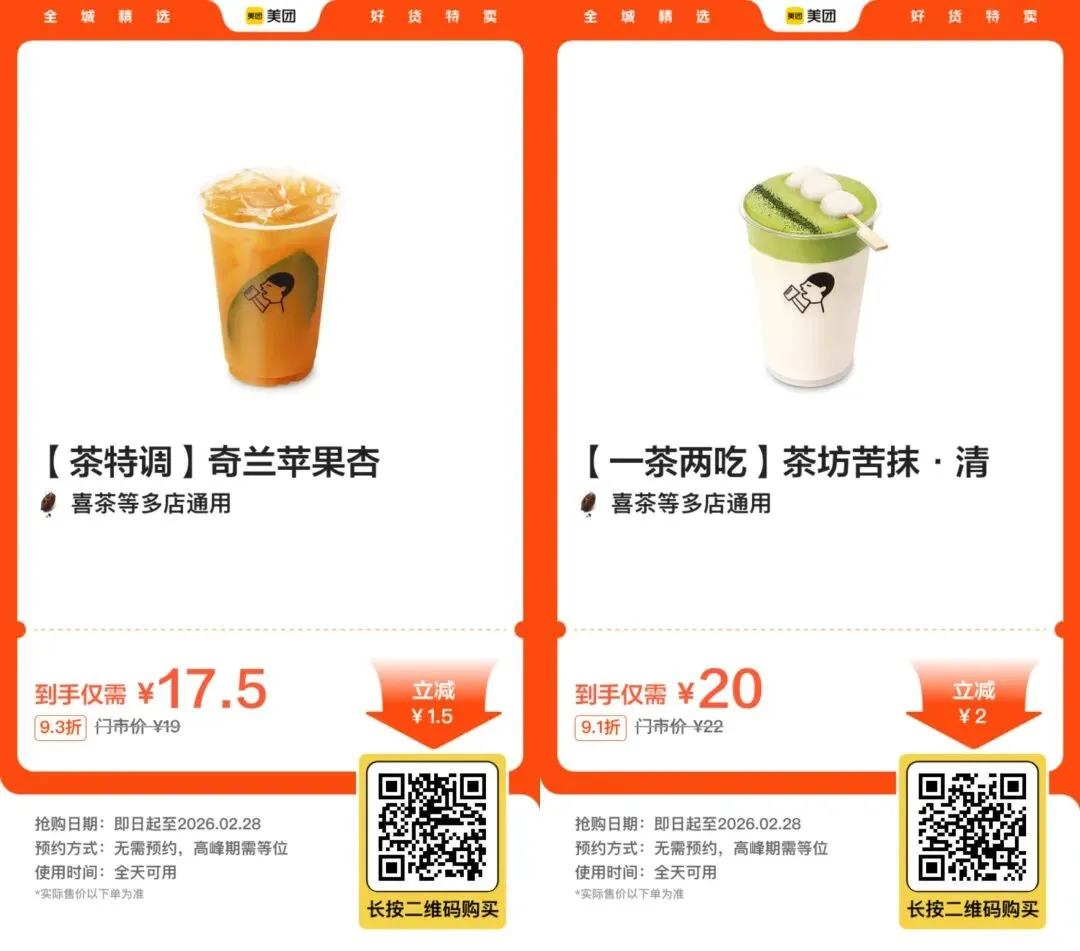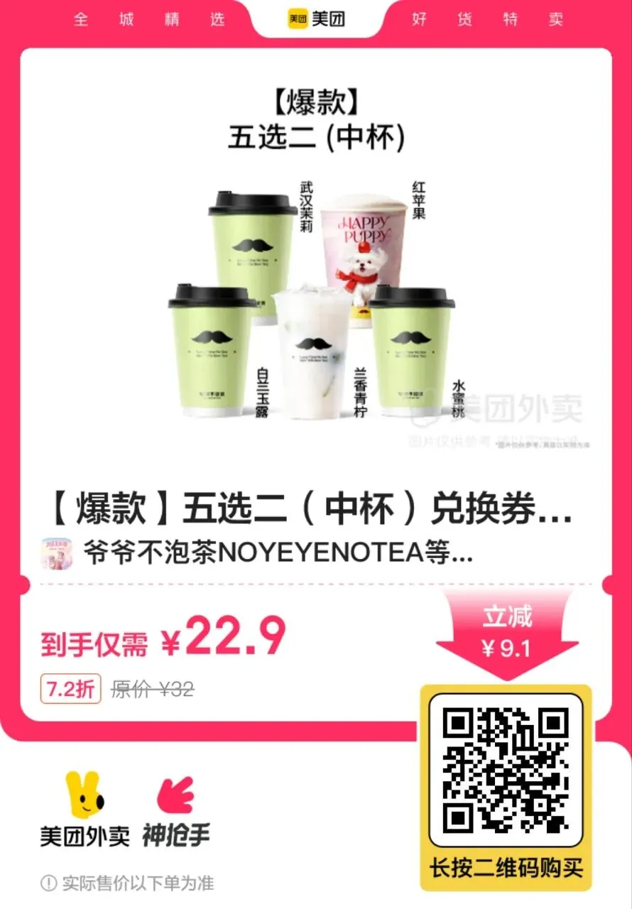 13,【美团外卖】爷爷不泡茶5选2 22.9元【今日新增】