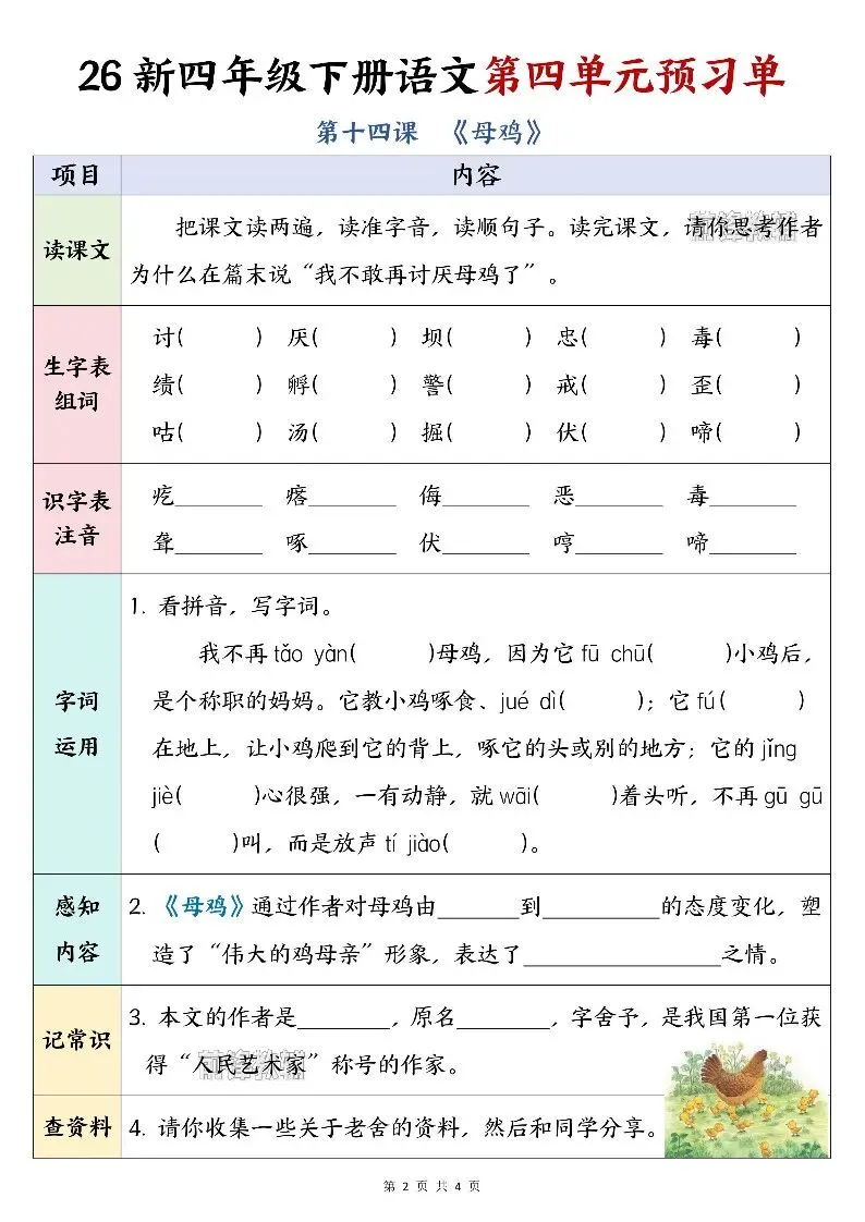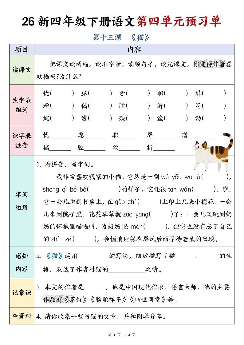 26新四年级下册语文第四单元预习单(电子版可打印)