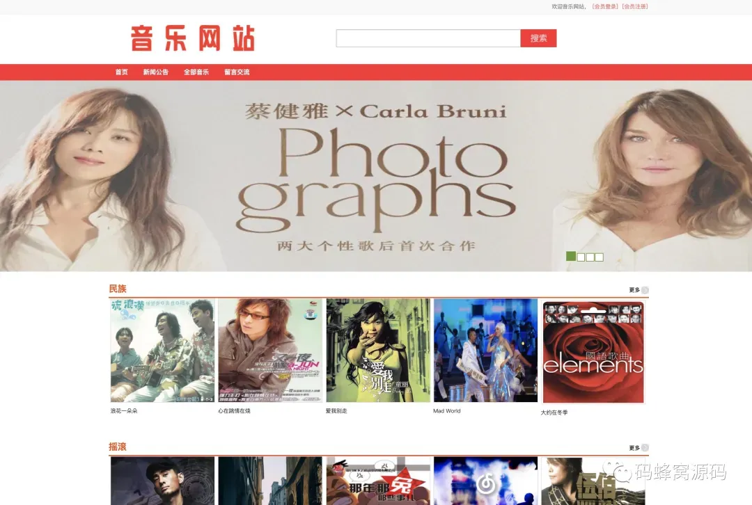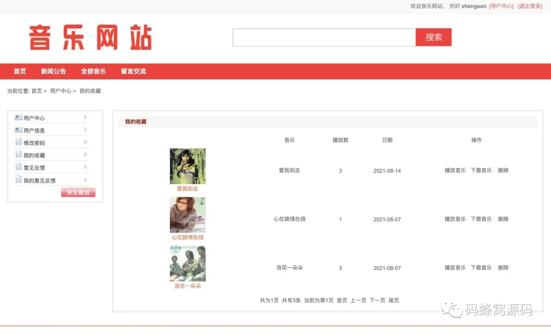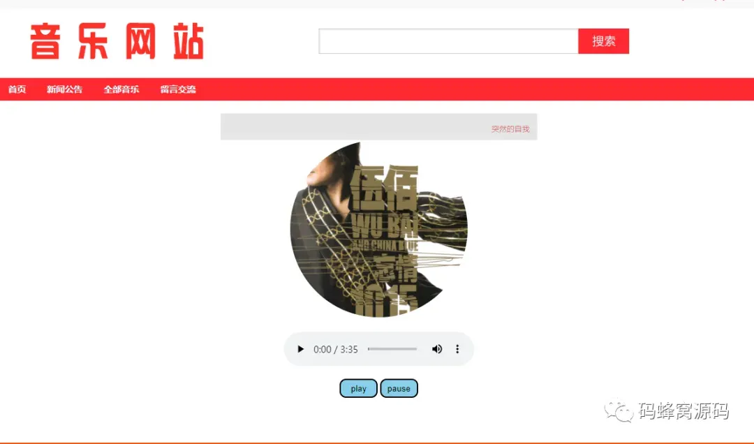 前台首页、音乐浏览、音乐搜索、音乐分类查找、音乐详情、音乐播放、音乐下载、添加收藏、新闻公告、留言交流、用户注册、用户登陆、个人中心、用户信息修改、我的收藏、意见反馈、修改密码等功能。