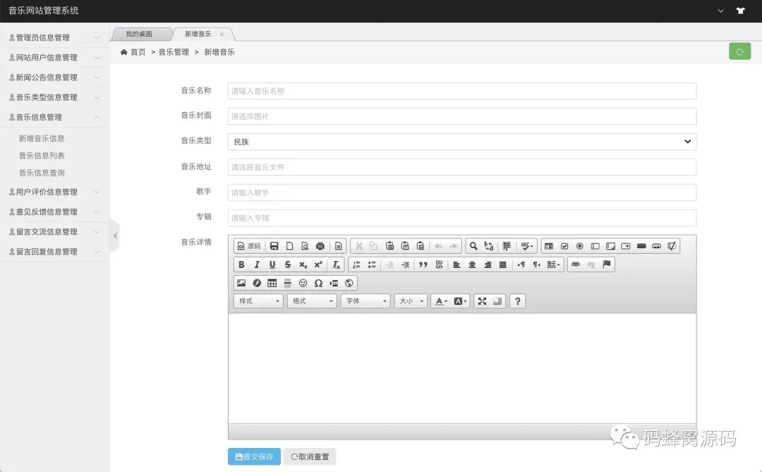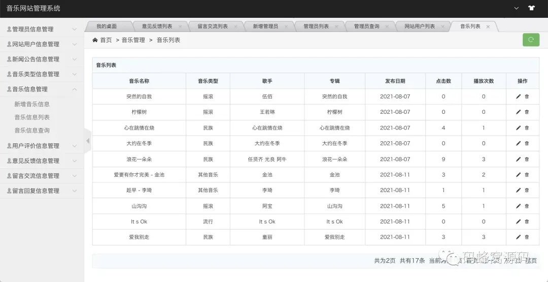 后台系统登陆、管理员管理、用户信息管理、音乐管理、音乐类型管理、新闻公告管理、用户评价管理、意见反馈管理、留言交流管理、消息回复管理等功能。