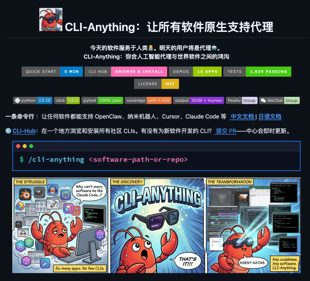 CLI-Anything 在 README 顶部写了一句话: