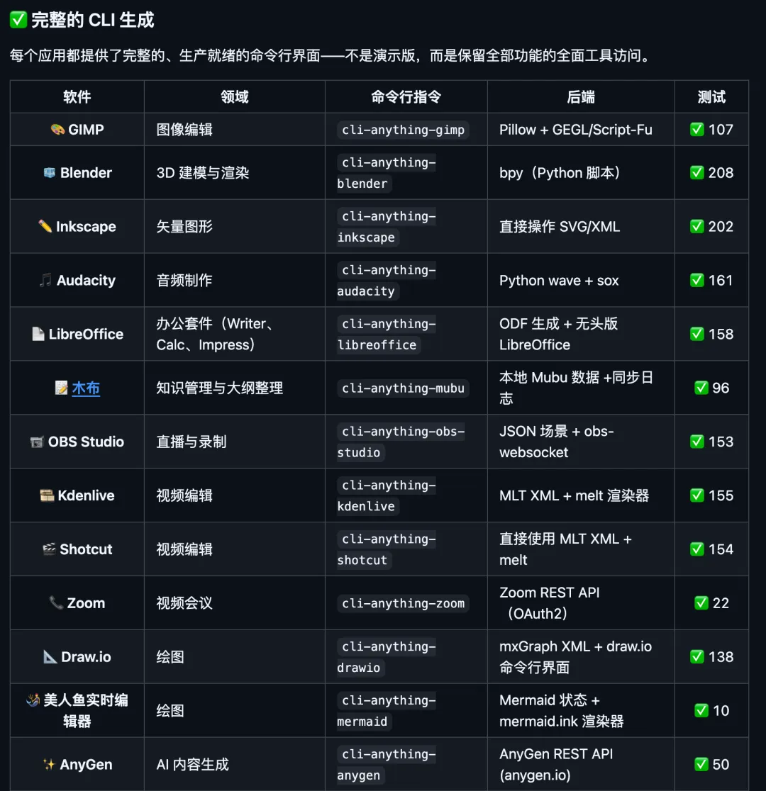 它会自动扫描代码,生成一套完整的命令行接口,Agent 通过命令行就能操控这个软件的全部功能。