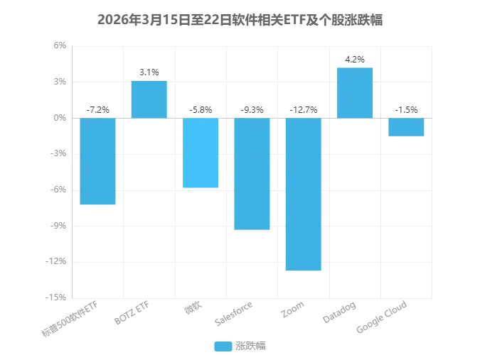 市场反应呈现显著的板块分化特征。3月15日至22日期间,标普500软件ETF(XSW)累计下跌7.2%,而专注于AI基础设施的BOTZ ETF同期上涨3.1%。个股层面,传统办公协同类SaaS企业遭受重创:Microsoft 365相关业务收入占比超40%的微软股价下跌5.8%,Slack母公司Salesforce跌幅达9.3%,Zoom更是重挫12.7%。相比之下,提供AI开发工具的Datadog逆势上涨4.2%,AWS直接竞争对手Google Cloud相关板块仅微跌1.5%。