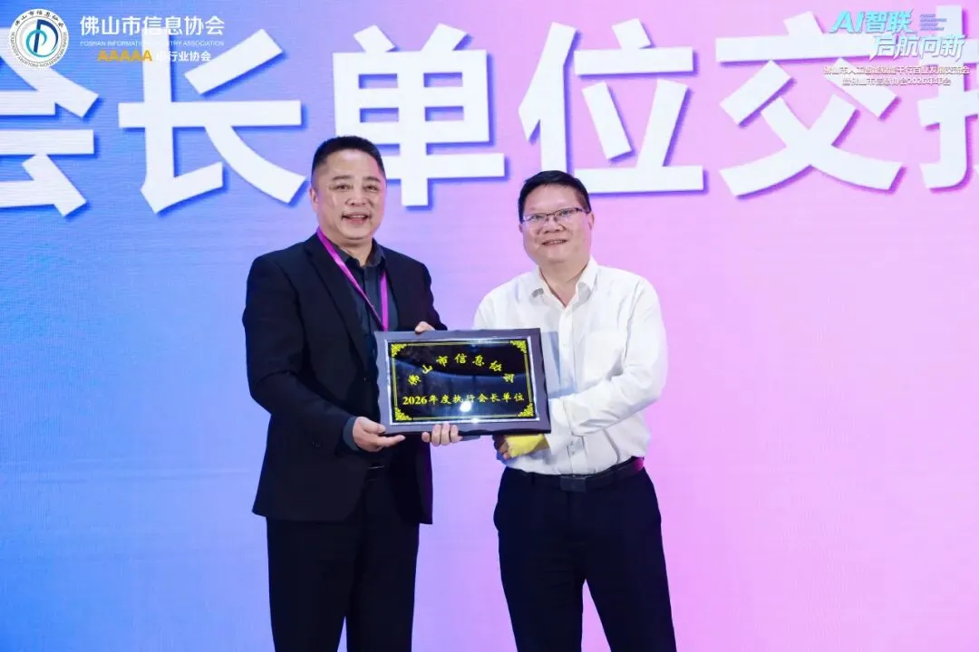 现场还举行了2026年度执行会长单位授牌仪式。新一任执行会长单位——中国电信股份有限公司佛山分公司总经理关坚成表示,将依托中国电信“星辰”大模型等自研AI能力,联合会员单位探索AI在智能制造、智慧城市、智慧医疗等领域的深度应用,推动技术从“尝鲜”走向“常用”,助力佛山制造业降本提质增效。