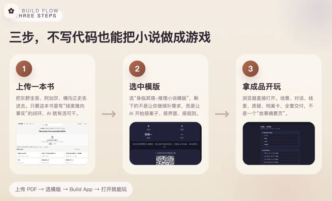 任何叙事型内容 ↓ 提取结构化知识(人物、场景、线索、机制) Skills 技能包 ↓ 套用游戏模版 可玩的交互游戏