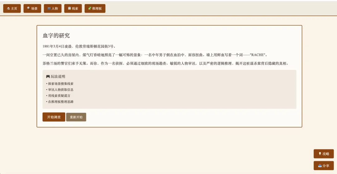 大模型显然捕捉到了这种温情底色上的犯罪基调:米黄稿纸底色、楷体标题、仙贝棕色按钮、横竖细线的文具质感。整个页面像一张老式信件,而不是一间冰冷的刑侦实验室。