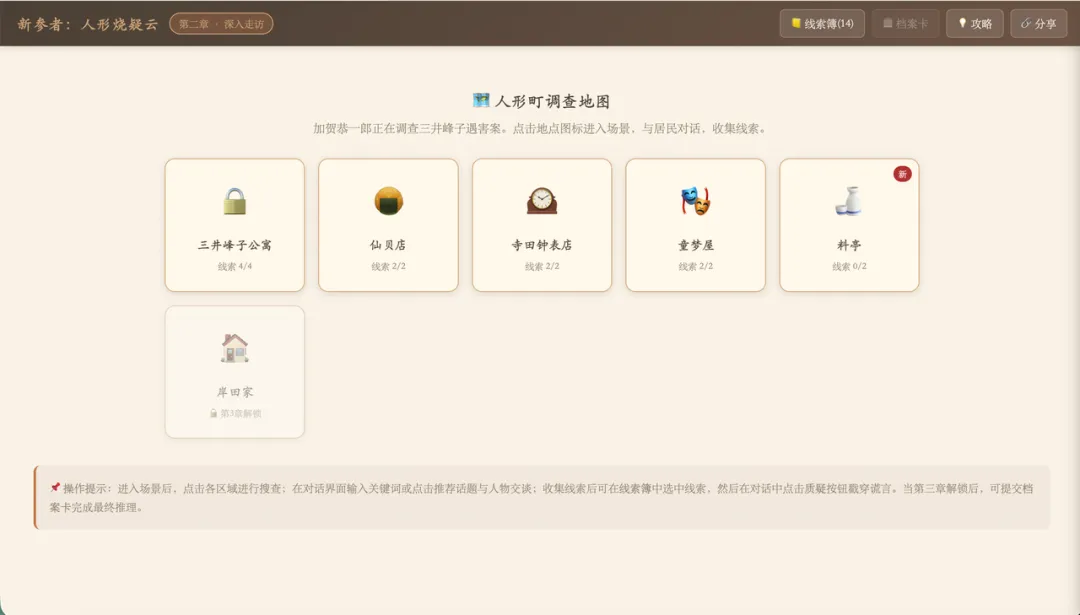 三本推理小说,三种视觉风格,三套故事线。但底层结构一致——场景探索、角色对话、线索收集、谎言质疑、攻略提示、档案卡提交。