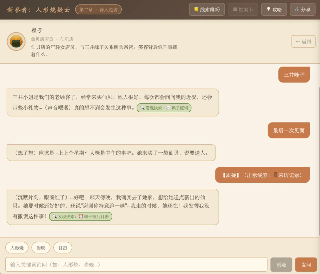 游戏完整还原了这条传递链:修平代泰治购买 → 泰治送给女友浅美 → 浅美不喜欢和式点心转赠邻居 → 邻居恰好是死者三井峰子。一盒人形烧经过四个人的手,每个人都有自己的小心思,但没有一个和谋杀有关。这正是东野圭吾在《新参者》里最擅长的手法——用看似关联案件的线索,揭开一段段与案件无关的人情世故。游戏游玩的过程与小说走向基本一致,但在每个阶段增加了一些自由性。玩家可以拿已知的线索去质疑npc,让游戏在相对固定的推理链路下有较为自由的游玩体验。