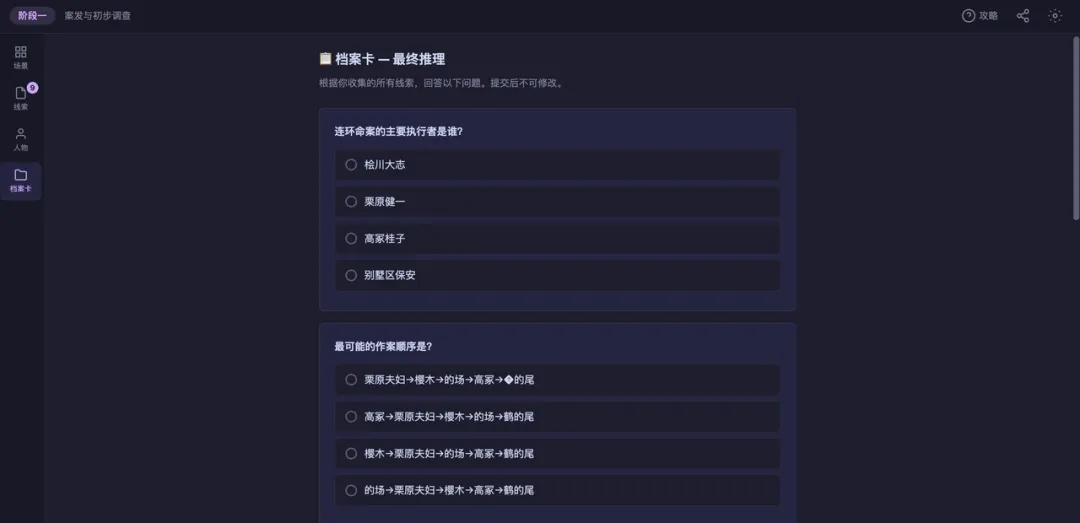 AI 已经产出一个完整的 Web 应用,浏览器直接打开就能玩。场景探索、角色对话、线索收集、谎言质疑、档案卡提交——全套。