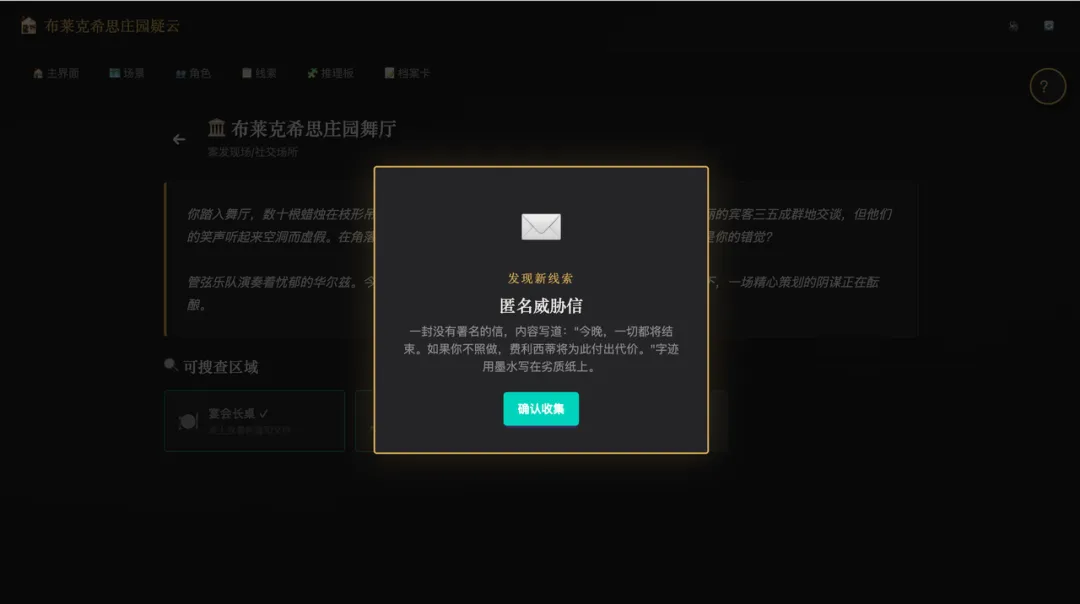 大模型还为这本小说生成了推理板功能,方便玩家实时整理线索(毕竟这本小说的线索和细节多到爆炸,实在是需要一个地方来梳理所有的秘密和线索了)