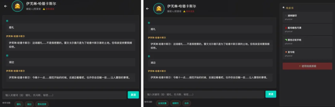 原著最精彩的部分是揭开每个角色的内心秘密,而这些内容被塞在了8个角色的对话中。比如和伊芙琳聊天,默认推荐的关键词是“婚礼、湖边、费利西蒂”——这是表层信息;当你去湖边探索后,推荐自动切换为“血液胶囊、镇定剂、自杀”。这种推荐切换的节奏,还原了原著中“每多知道一层,这个人就在你眼中变了一个样”的阅读体验。