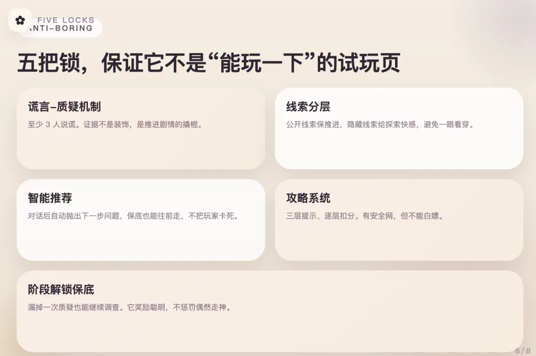 第五把锁:阶段解锁不依赖质疑。 质疑是奖励而非门槛。漏掉质疑游戏仍然能往下走,只是得分低。防止玩家被锁死。