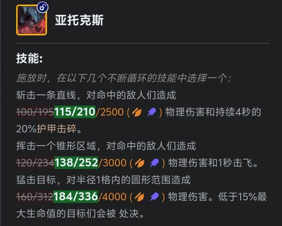 这次更新以后亚托克斯三个技能都是巨大提升,这三个技能有破甲、控制、处决。搭配神器连指手套使用的话,就是普攻衔接破甲,破甲衔接击飞控制一手,再接技能处决敌人。目前除了7费卡塞拉斯自带3个技能,仅剩下剑魔能与他抗衡了吧。2次更新加强后的剑魔战斗力直逼7费卡塞拉斯,赛季末冲分必定玩的棋子。