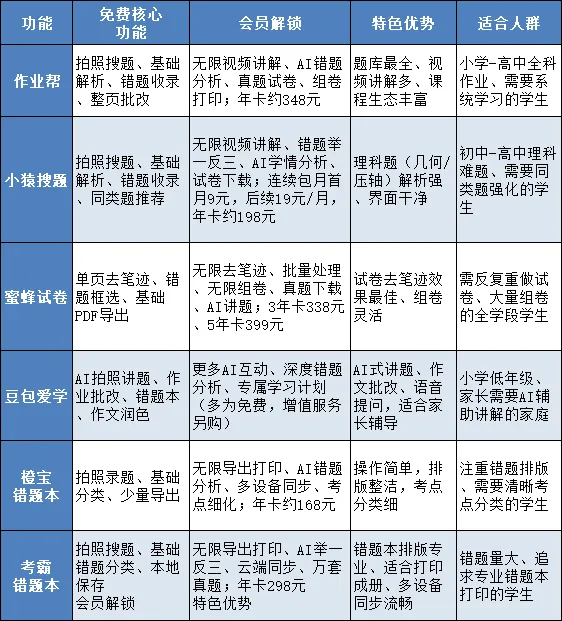 1. 日常作业答疑:选作业帮或小猿搜题,题库和解析最全面。2. 试卷重做/错题组卷:选蜜蜂试卷,去笔迹和组卷功能最强。3. AI辅导/家长省心:选豆包爱学,大模型讲题和作文批改是亮点。4. 专注错题整理打印:在橙宝错题本和考霸错题本中选,前者性价比高,后者功能更全。