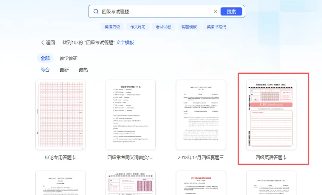 四级写作占总分的15%,而且是四级考试开始时第一道限时题,因此也非常重要。在WPS中,我们点击新建文档,可以通过搜索或点击热门搜索词,可以查找到四级范文、作文模板、四级词汇等资源,再也不必为买某库会员而烦恼了。