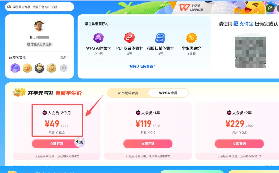 讲了这么多,你一定想试试如何使用上面介绍的这些功能。建议你使用前买个WPS的季度会员,因为距备考只有3个月,可以买一个季度的大会员。新学期的福利正在派送,可以访问vip.wps.cn,通过支付宝认证学生身份,就能以优惠的价格买到大会员。毕竟,会员集成了AI的权益,对于四级备考更有帮助。