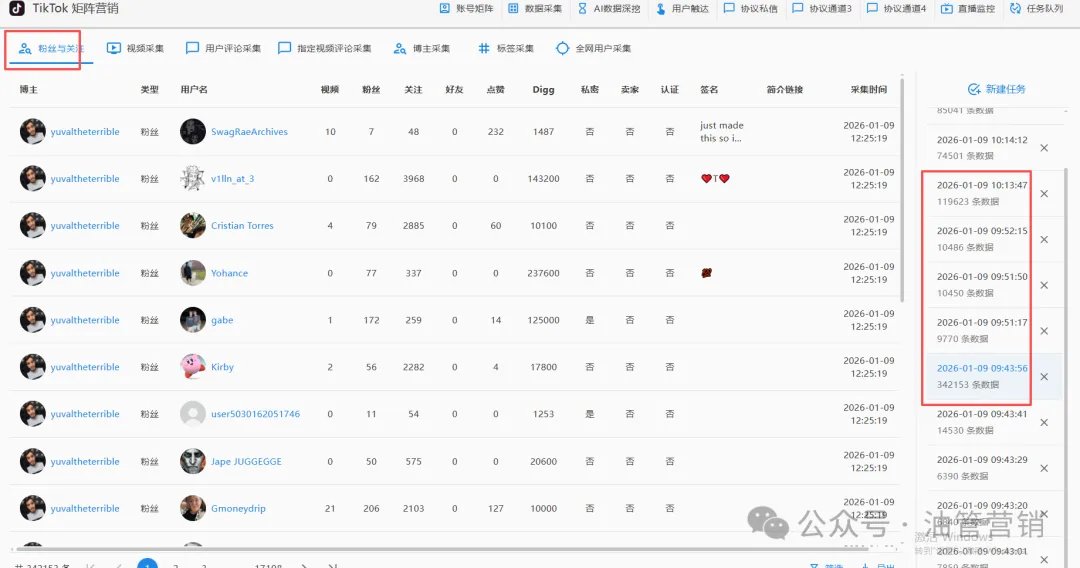 一个成熟的TikTok推广工具,会把“数据”放在非常核心的位置。通过协议级采集能力,可以直接获取同行账号粉丝、指定视频评论用户、活跃互动人群等第一手数据来源。这些用户本身已经对同类内容产生过兴趣,天然具备更高的转化潜力。