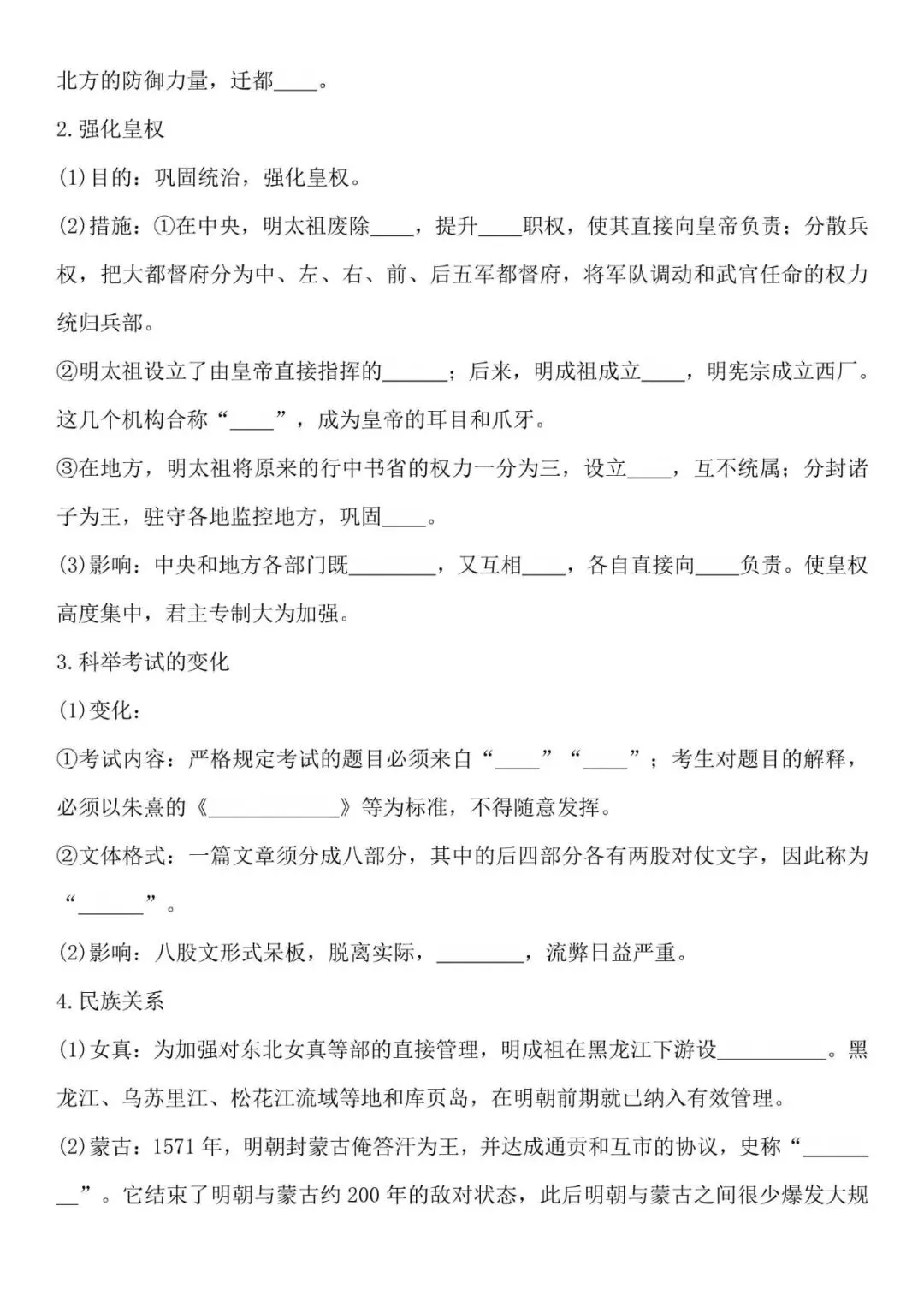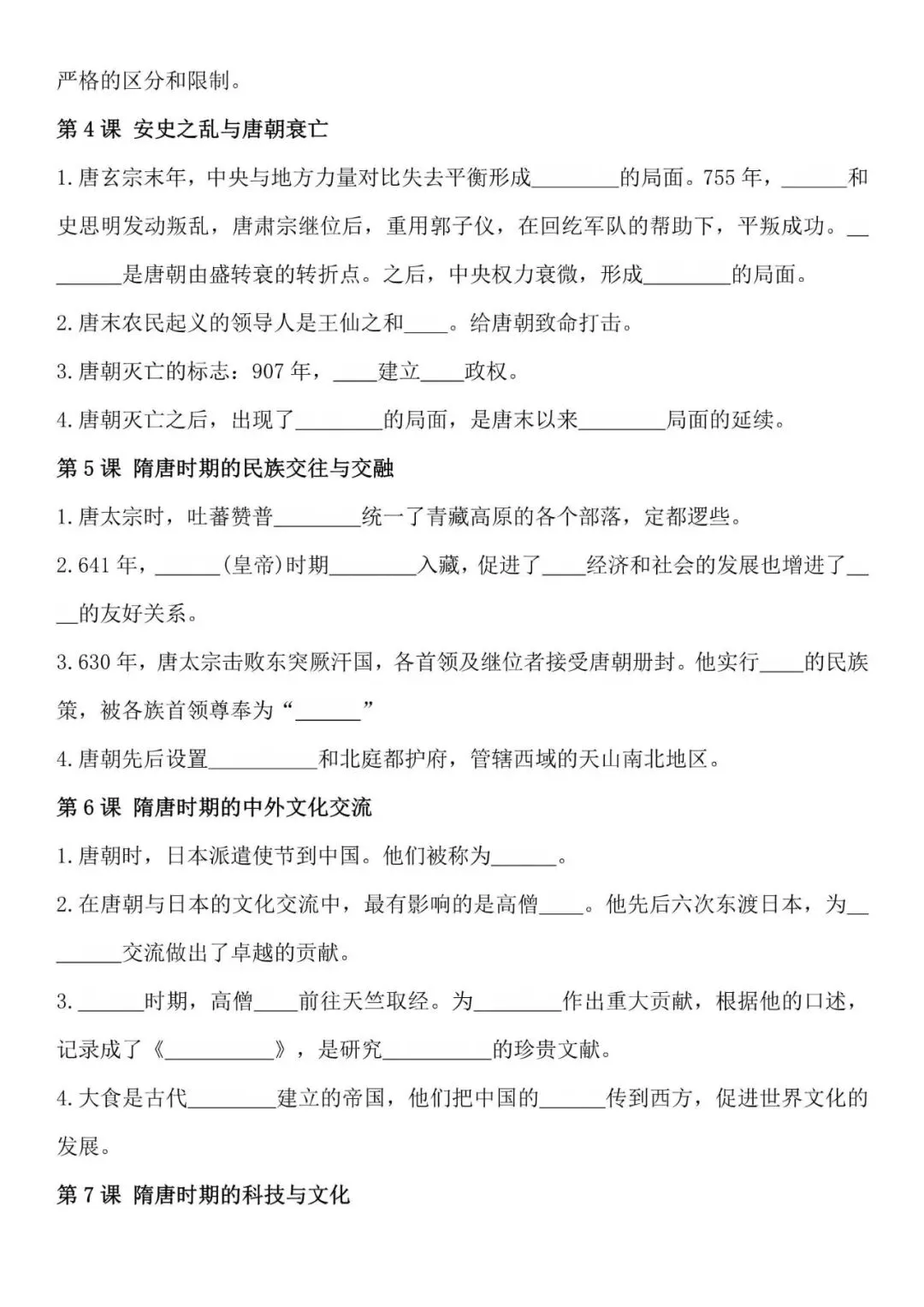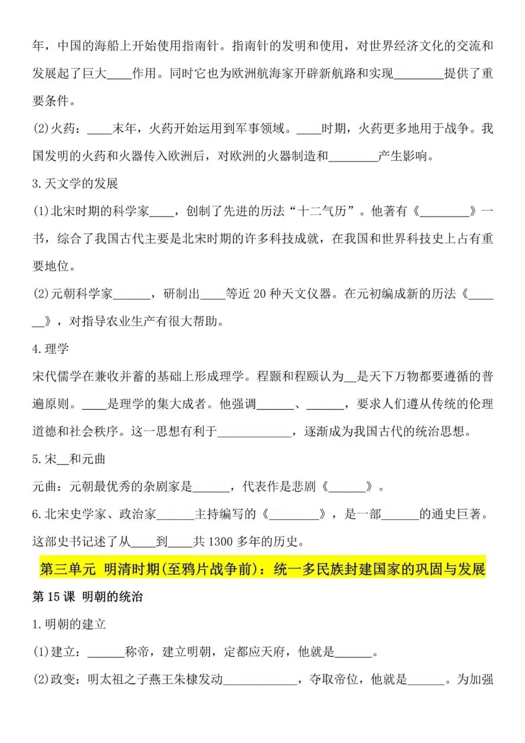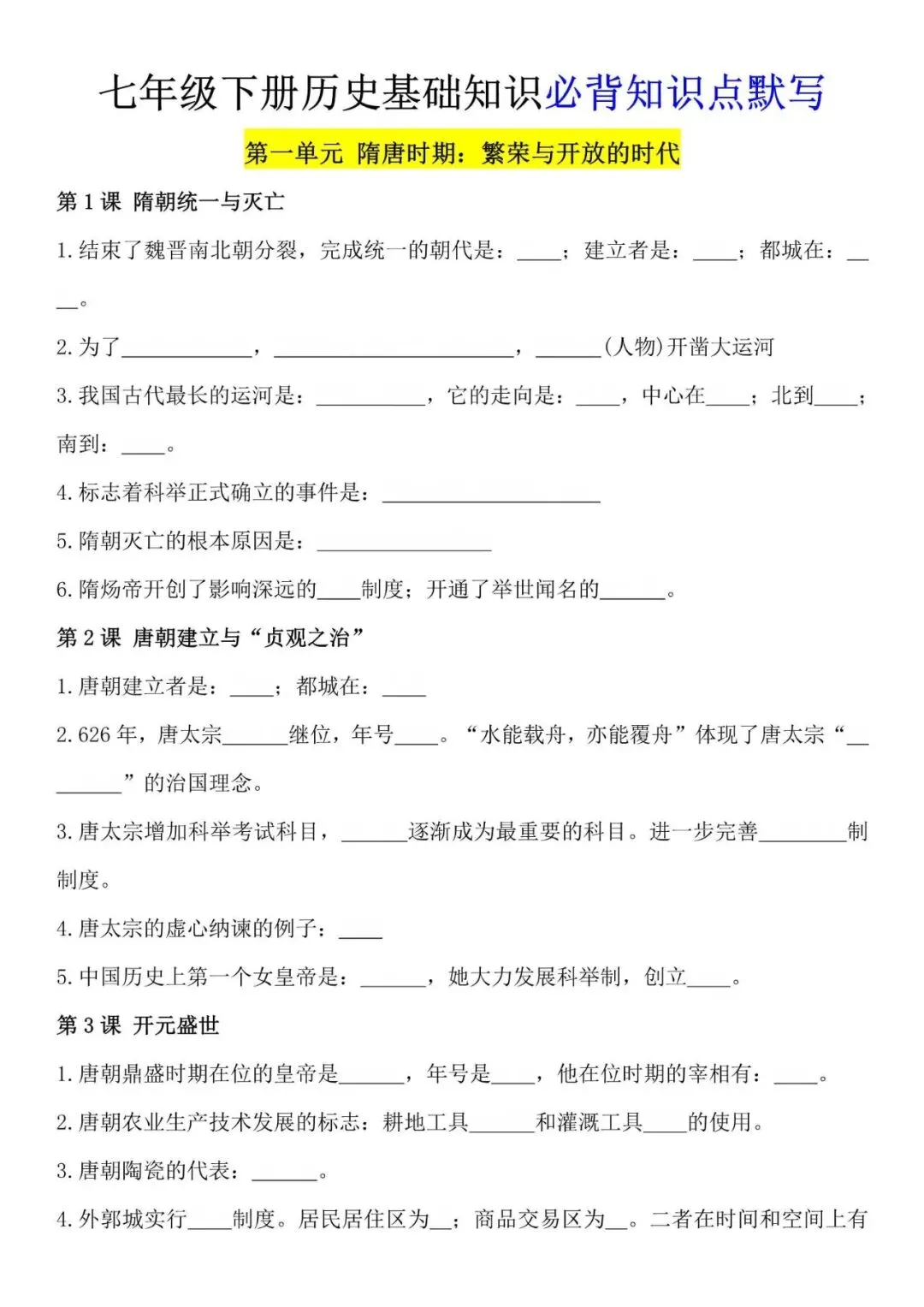 七年级下册历史必背知识点,默写填空版,电子打印版!
