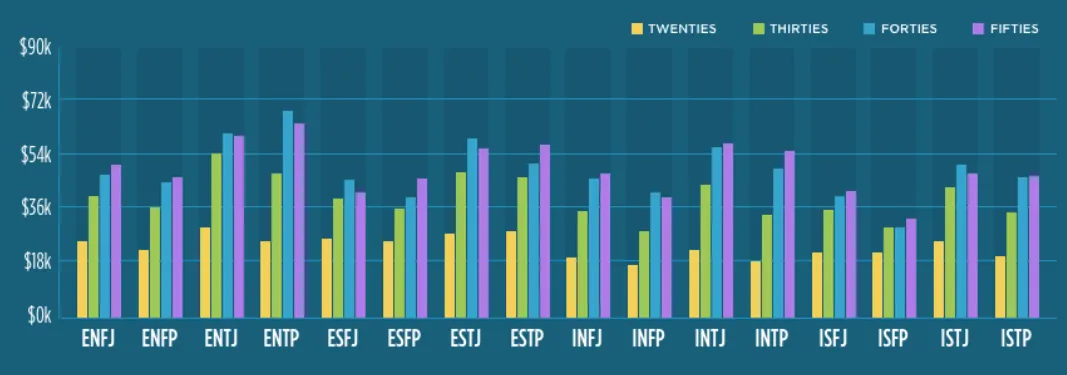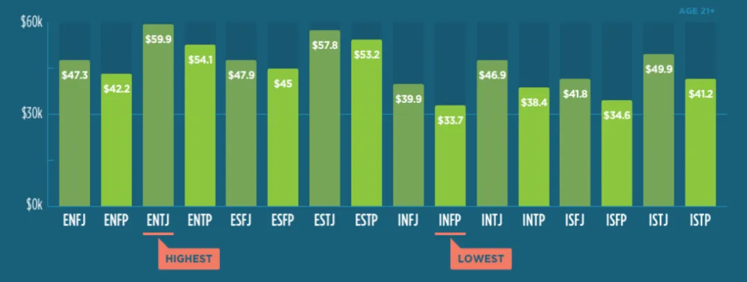 收入最高的类型的平均收入比收入最低类型高78%。收入最高的类型是ENTJ(指挥官)人格和ESTJ(总经理)人格。