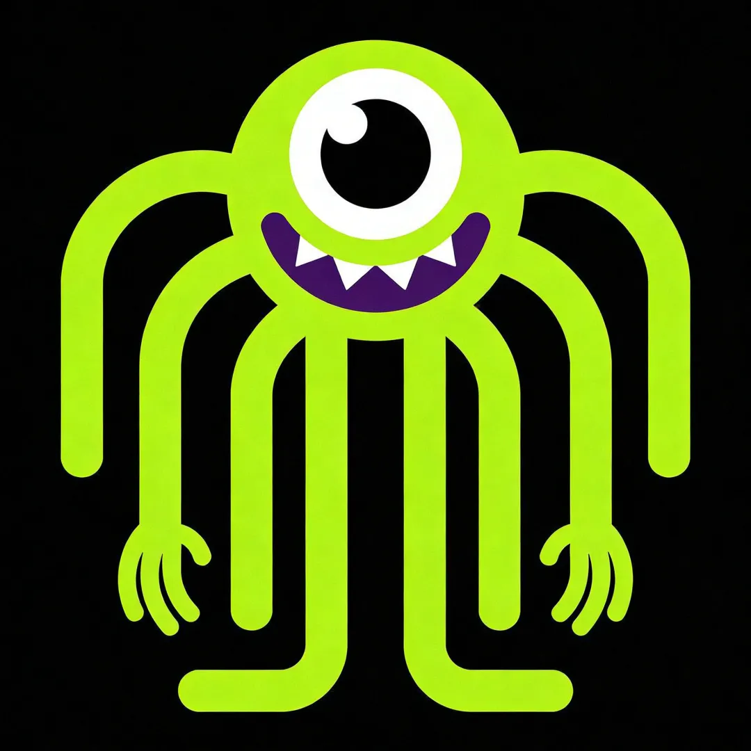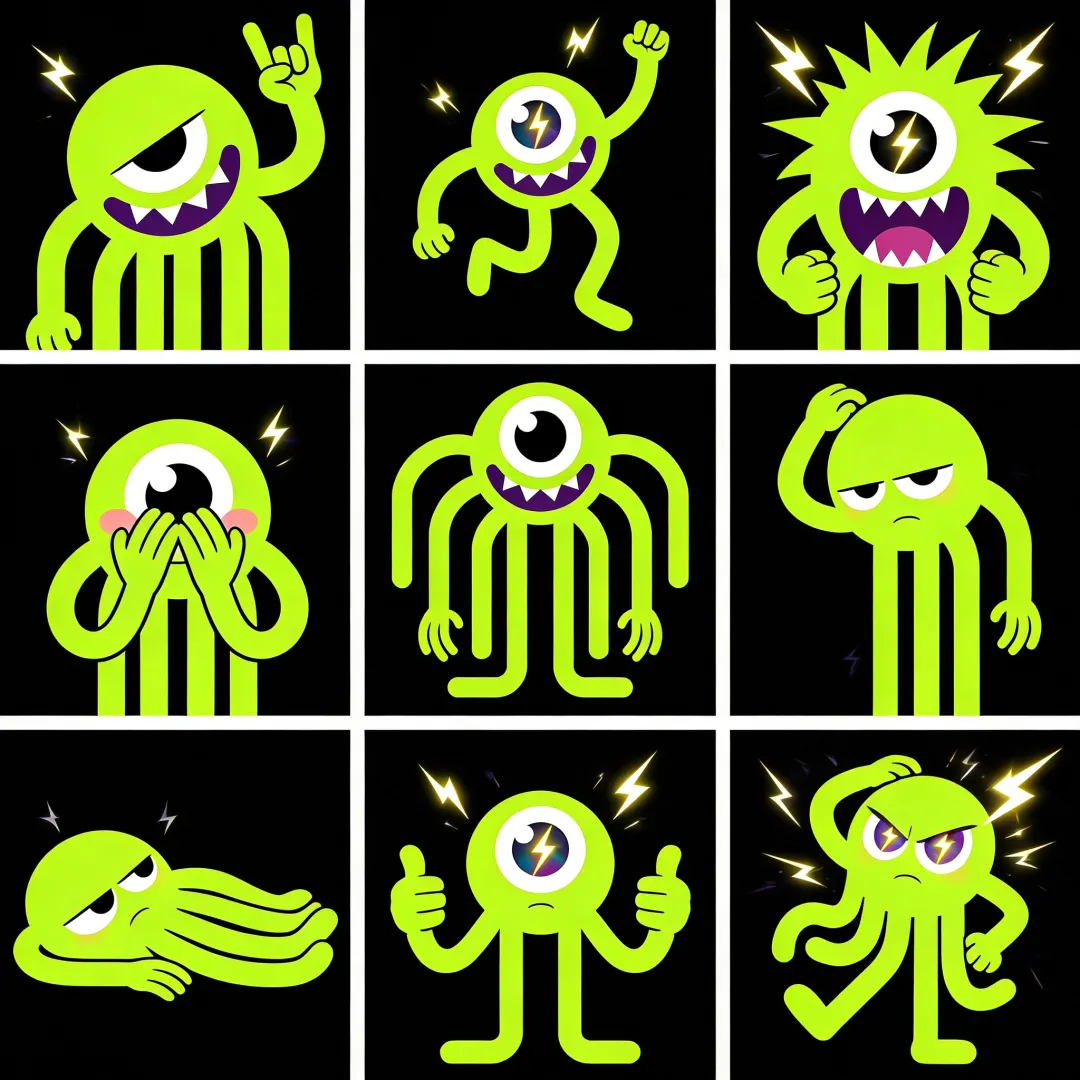 日式卡通涂鸦风格,整体叛逆酷拽氛围,线条随性利落,色彩鲜明对比强烈,8K 超高清,矢量质感,画面干净无杂物,纯黑背景衬托荧光绿主体。 3×3 整齐九宫格排版,所有表情均为 JZAQ 单眼绿色触手怪吉祥物 IP,严格保留核心特征:荧光绿色圆形头部,单只超大白色眼球,瞳孔边缘带彩虹色,眼球内部嵌入发光闪电特效,紫色锯齿状嘴巴搭配白色尖牙,多根荧光绿色触手,触手末端带小手造型,潮酷可爱兼具。 逐格表情设定: 左上(坏笑歪头):单眼微眯,眼中闪电闪烁,一根触手比出摇滚手势,叛逆拽酷。 中上(开心蹦跳):触手向上摆动,眼中闪电欢快闪烁,表情活泼得意。 右上(生气炸毛):瞳孔放大,眼中闪电变粗,触手攥拳,嘴巴大张露出尖牙,气场凶狠。 左中(害羞捂脸):两根触手遮住嘴巴,单眼带淡粉红晕,眼中闪电柔和闪烁,腼腆可爱。 正中(基础站姿):表情中性,触手自然垂落,眼中闪电平稳发光,标准 IP 原型姿态。 右中(疑惑挠头):头部歪向一侧,一根触手挠头,单眼眯起,眼中闪电变小,呆萌困惑。 左下(躺平摆烂):触手瘫软舒展,眼睛半闭,眼中闪电微弱,表情慵懒随性。 中下(点赞打 call):两根触手比赞,眼中闪电跳动闪烁,表情得意应援。 右下(放电耍酷):眼中闪电强烈发光,触手摆出酷炫 pose,整体拽酷潮流感拉满。 线条干净利落,高对比度配色,无多余阴影,适配聊天表情包使用,保证 IP 视觉高度统一。,比例 「1:1」