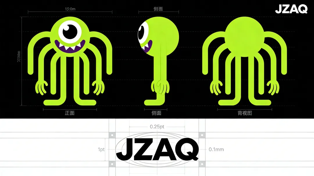 超高清,极致细节,矢量排版规范,专业设计提案质感。 居中构图,上下分栏布局,主体清晰。 柔和均匀光线,无复杂阴影,色彩通透干净。 上半部分:卡通 IP 吉祥物 JZAQ 三视图设计。 JZAQ 单眼绿色触手怪 IP,整体造型可爱潮玩风格。 核心特征:荧光绿色圆形头部,单只超大白色眼球,黑色瞳孔,紫色锯齿状嘴巴带白色尖牙,多根荧光绿色触手,触手末端带小手造型,扁平矢量线条。 三视图要求:正面、侧面、背面三视图整齐排列,同一角色比例一致,配饰细节统一,姿态标准站立。 背景:纯黑色背景,突出 IP 主体,添加简单尺寸标注。 风格:扁平化卡通,线条简洁流畅,配色高对比清晰。 下半部分:潮玩品牌JZAQ几何 Logo 设计。 核心要求:依托笛卡尔坐标系辅助线确立线条走向,0.25pt 精度线条分割,同心圆辅助线定位,构建嵌套式几何图形,突出线条空间层次感。 精度规范:各元素间距误差小于 0.1mm,结构精准规整。 右上角:添加小页眉规范标准单色 Logo,单色设计无多余装饰。 风格:极简科技风,几何嵌套结构,线条利落高级,彰显品牌精准专业属性。 整体色调:黑白单色为主,搭配荧光绿点缀,与 IP 视觉风格统一。,比例 「16:9」