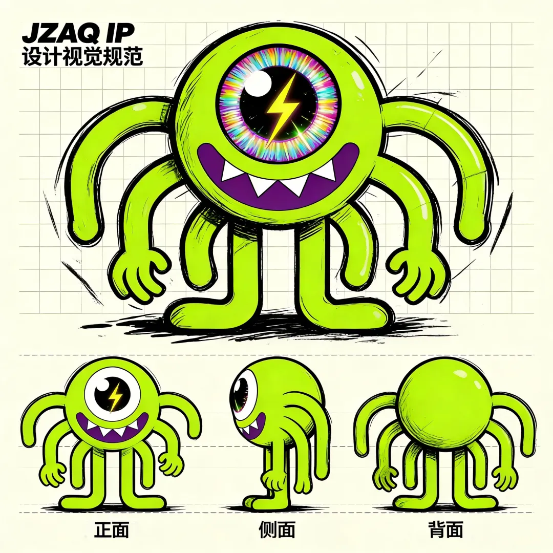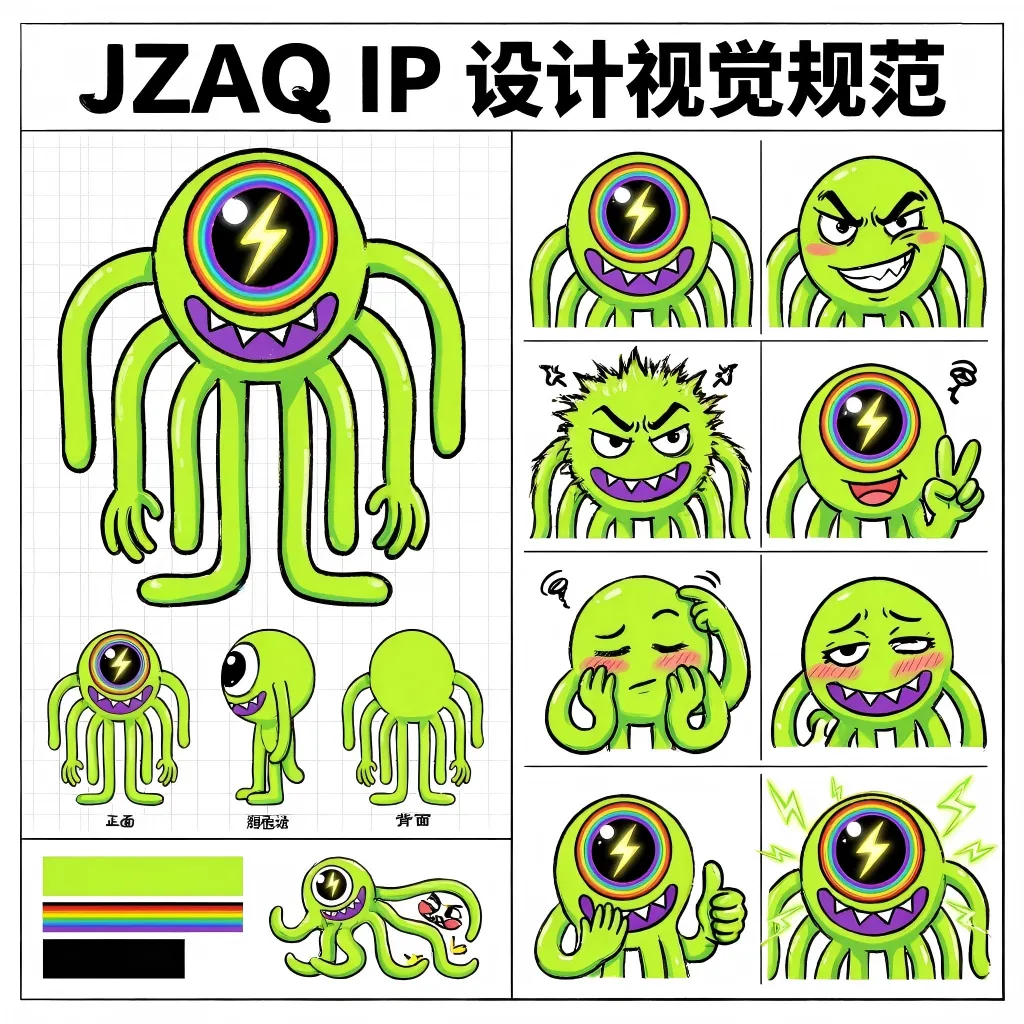 日式卡通涂鸦风格,整体叛逆酷拽氛围,线条随性又利落,色彩鲜明有街头感。 一只可爱的 JZAQ 吉祥物 IP 设计,单眼造型,荧光绿主体,紫色锯齿嘴,多根灵动触手,整体潮酷可爱。 大眼睛醒目,瞳孔边缘带彩虹色,眼中嵌有发光闪电元素,自带叛逆酷拽气质。 背景带有浅色格子辅助线,简洁分区布局,专业规范感强。 构图包含居中主体形象、正面 / 侧面 / 背面三视图、颜色规范(以荧光绿为主调,搭配紫色、彩虹色、黑色等色彩细节)、动作规范(展示叛逆酷拽的不同姿态)。 标题醒目标注 “JZAQ IP 设计视觉规范”,整体风格清晰明了,用于指导 IP 视觉规范内容,画面干净层次分明。