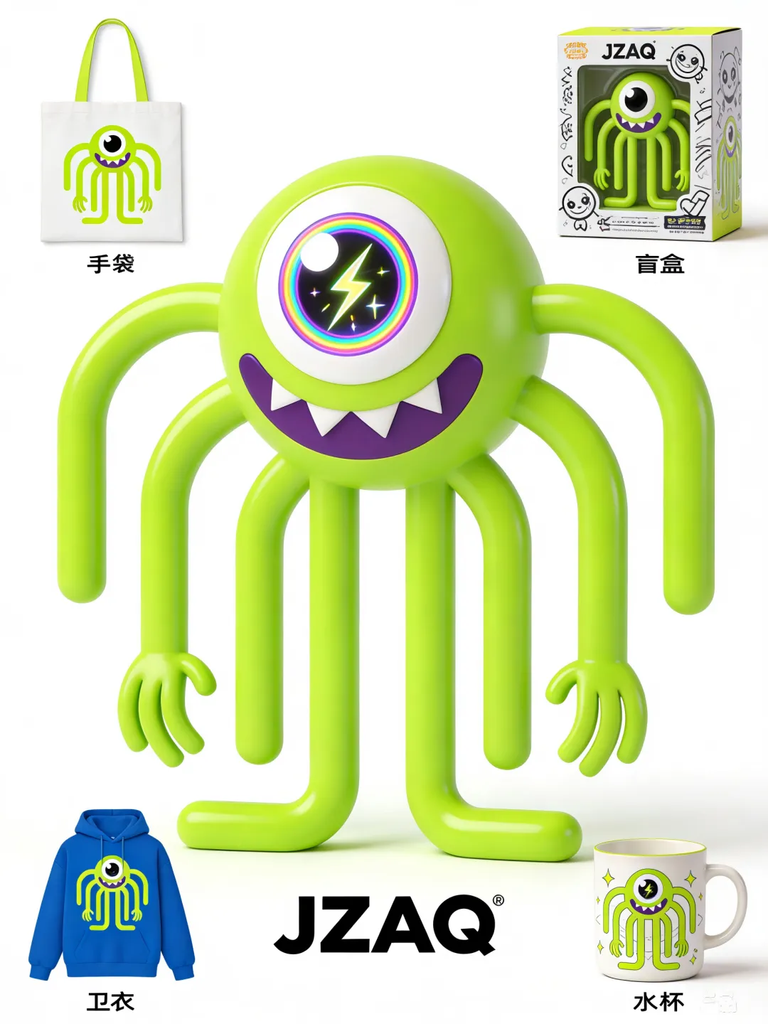 3D 立体可爱风 JZAQ 单眼绿色触手怪吉祥物 IP 产品海报,主体为荧光绿色触手怪 —— 细腻哑光绿身带柔亮荧光光泽,单只巨大白色眼球,瞳孔边缘绕彩虹色渐变,大眼睛内嵌发光闪电(闪电带细碎光效),紫色锯齿嘴配白色尖牙,多根灵动绿色触手带小手造型,整体潮酷可爱兼具。 下方醒目呈现 “JZAQ” 品牌无衬线 Logo,字体硬朗利落,与 IP 视觉风格统一。 突出周围错落陈列品牌周边产品:画面左上角为白底印 IP 形象的荧光绿帆布包、画面右上角为嵌 IP 单眼绿色触手怪吉祥物的潮玩盲盒(盒面带日式涂鸦线条)、画面左下角为印有 IP 绿触手怪图案的蓝色卫衣、画面右下角为IP 造型陶瓷杯(杯身印单眼 + 触手元素)。 构图采用 “中心 IP + 环绕产品” 的聚焦式布局,色调以荧光绿、白色为主,用 IP 眼部彩虹闪电与产品局部浅紫点缀撞色,光线柔和且在 IP 触手、锯齿嘴边缘、产品表面打细腻高光,符合产品海报的宣传属性,8K 超高清,质感通透,细节丰富。,比例 「3:4」
