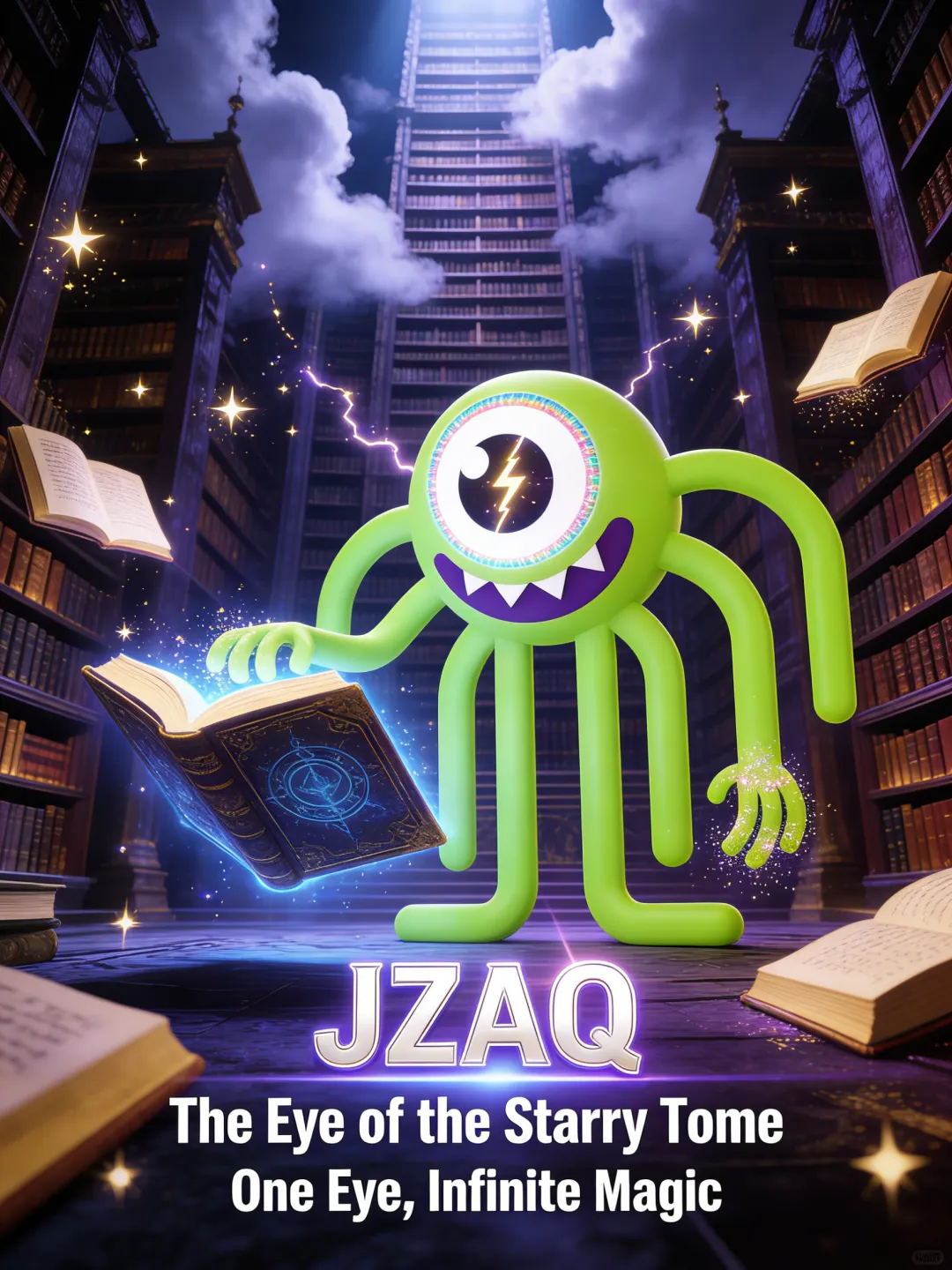 一幅电影海报,采用戏剧性构图与强烈光影对比,画面以深色调为主,3D 立体的可爱 JZAQ 单眼绿色触手怪,置身于奇幻电影风格的古老魔法图书馆,四周漂浮着发光的星尘书页,高耸的书架延伸至云雾缭绕的顶端。 JZAQ 核心 IP 特征强化: 荧光绿色立体触手造型,表面带着细腻哑光肌理与柔亮荧光光泽 单只巨大白色眼球,瞳孔边缘环绕一圈彩虹色渐变,大眼睛里嵌着一枚发光闪电(闪电带细碎流光特效) 紫色锯齿状嘴巴搭配白色尖牙,多根灵动绿色触手末端带着小手造型,触手上沾着闪烁的魔法粉末 它正用触手轻触一本漂浮的古旧魔法书,书页符文泛着幽蓝光芒,整体画面采用电影级奇幻光影,色调以紫蓝与荧光绿、金色交织,营造神秘治愈又潮酷的氛围,细节突出触手的立体肌理与眼部特效的流光感。 画面突出标题 “JZAQ”,3D 激光光效,下方搭配英语副标题:“The Eye of the Starry Tome”,以及宣传语:“One Eye, Infinite Magic”,字体风格硬朗利落,与 IP 潮酷气质统一。,比例 「3:4」