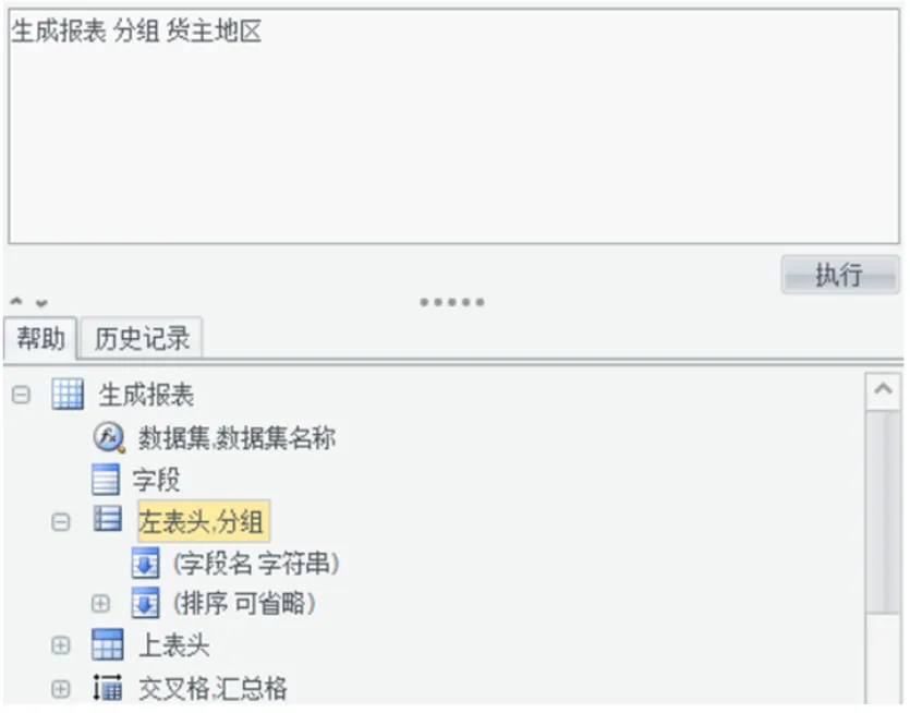在 Copilot 界面输入任意功能关键词时,下方帮助区域会自动匹配并列出对应的完整命令词及所需参数,例如生成分组报表,在 Copilot 界面输入功能词“生成报表”后,帮助区域会即时显示该命令的完整结构,可以清晰看到需补充的参数项(如数据集名称、字段、分组、汇总格等),指引我们精准补充“分组 字段名”等关键信息,确保指令能被 Copilot 准确解析并写入计算表达式