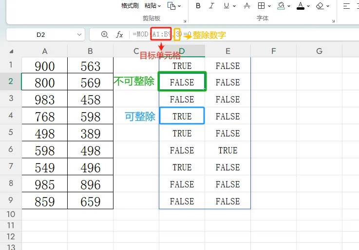 比如想要筛选A1到B9单元格能被3整除的数据,公式就是=MOD(A1:B9,3)=0,显示「TRUE」就是能整除,「FALSE」就是不能,下拉批量判断哈!
